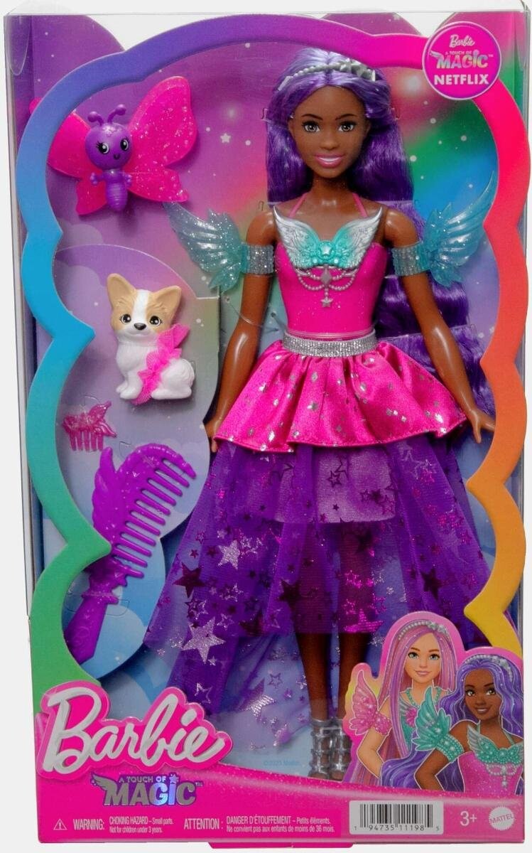 Кукла Barbie Pinch of Magic Brooklyn — идеальный компаньон для детей, которые любят волшебство и приключения. У куклы длинные фиолетовые волосы, которые можно укладывать разными способами. Она одета в блестящий розовый наряд, состоящий из платья с рюшами и крылышками. Веселью нет конца