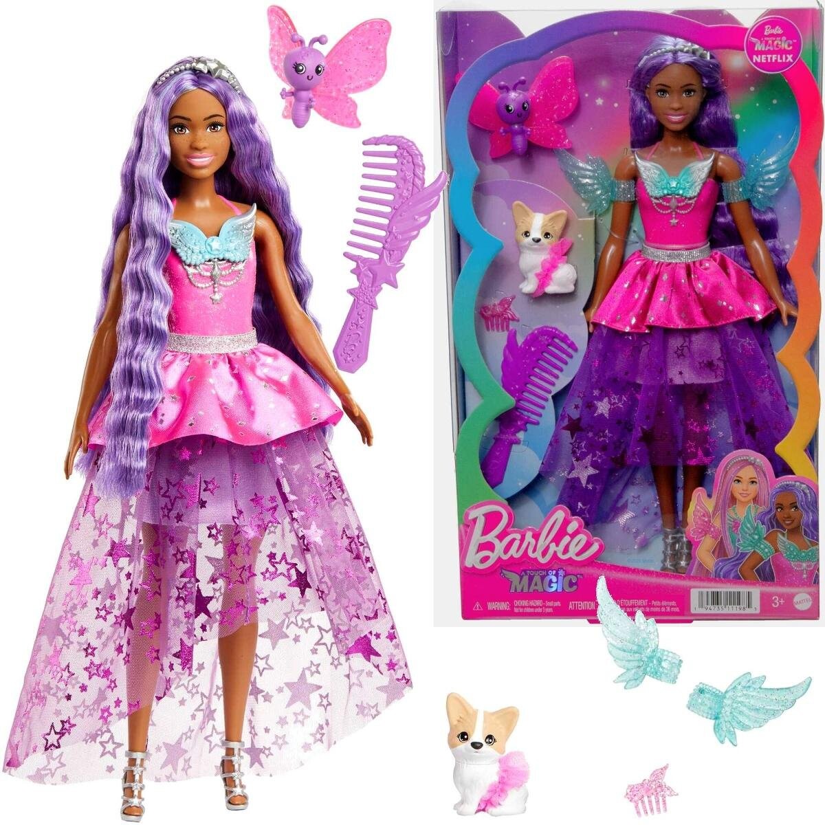 Кукла Барби «Бруклин» Робертс одета в сверкающий наряд, вдохновленный ее образом на экране. Два животных и аксессуары для укладки дополнят фантастическое развлечение. Кукла не стоит сама по себе. Цвета и декоративные элементы могут различаться. Щепотка волшебства