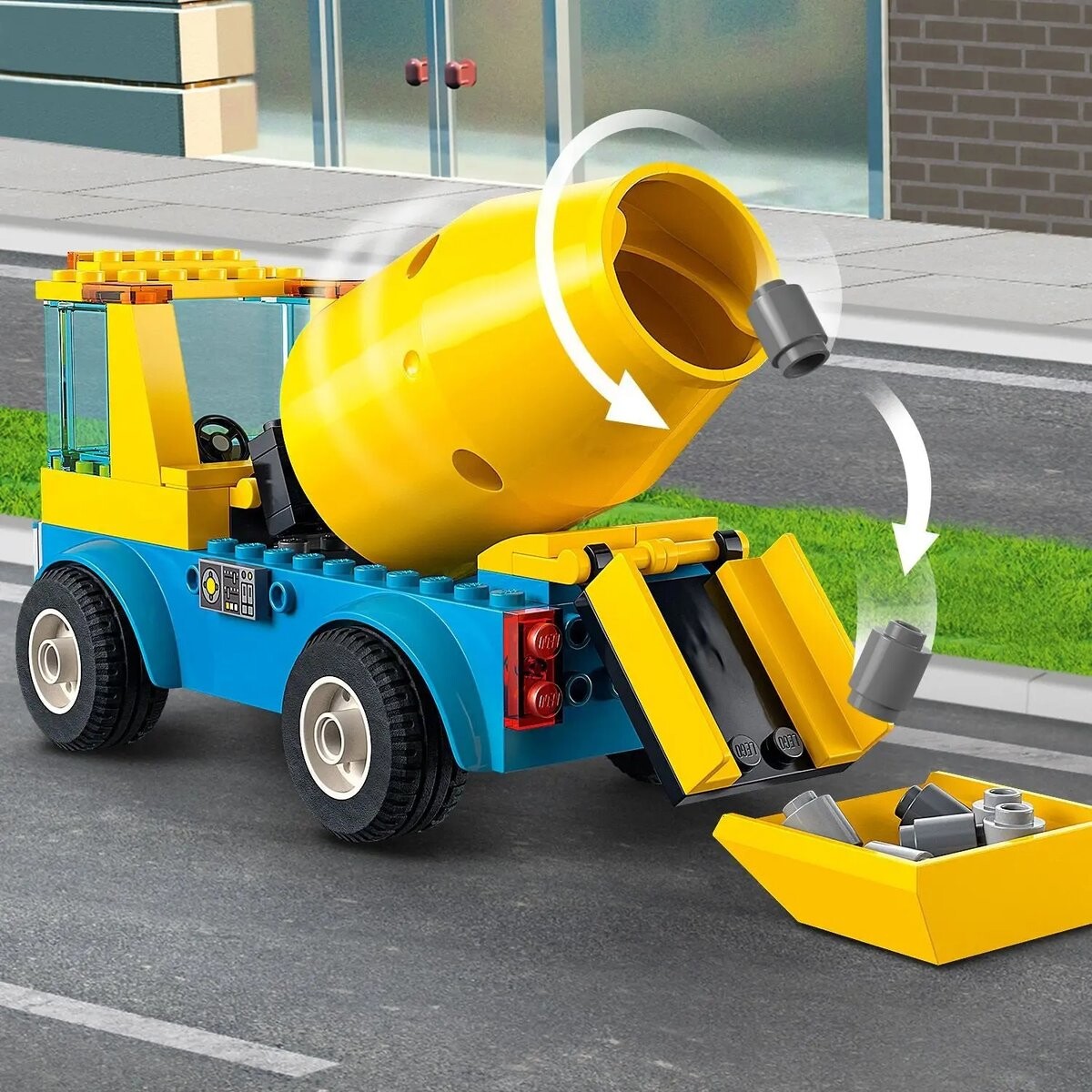 Дайте волю воображению детей. Транспортное средство из этого конструктора имеет открывающуюся кабину водителя и вращающийся смесительный барабан. В комплект также входят отбойный молоток, тачка и предупреждающий знак о строительстве. плюс две минифигурки строителей для часов творческой игры.