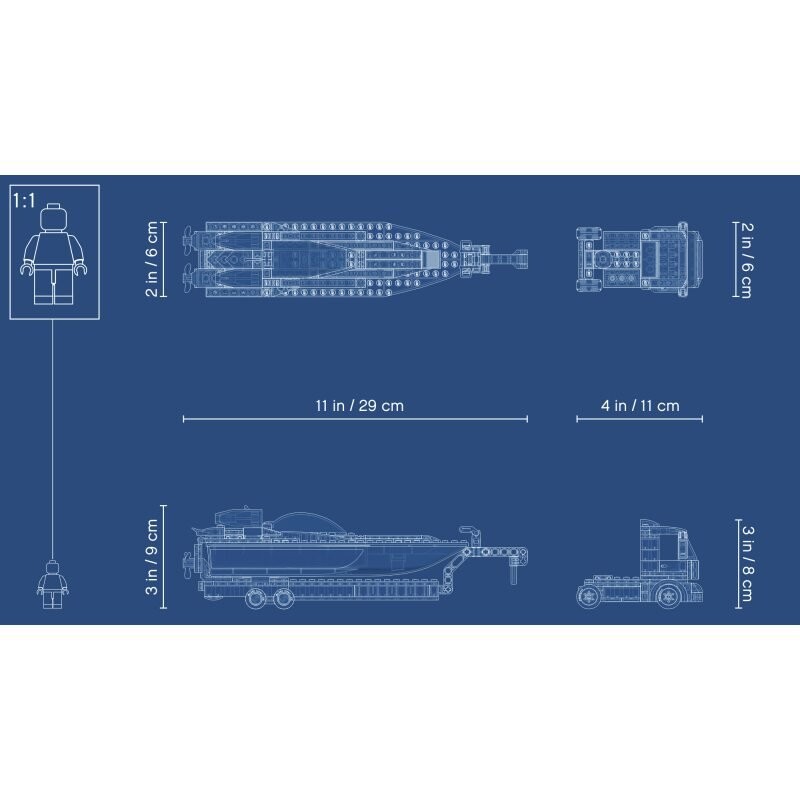 - В набор входит игрушечный транспортер с прицепом, плавучий гоночный катер и минифигурка автогонщика – все необходимое для творческой и самостоятельной игры.