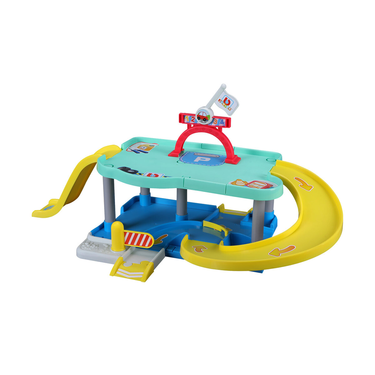 Двухуровневый гараж с парковкой, горкой, подиумом и другими аксессуарами.