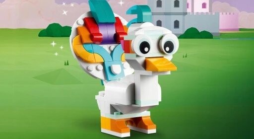 С помощью этого набора «Волшебный единорог 3-в-1» (31140) творческие дети в возрасте от семи лет и старше смогут отправиться в мифическую страну, где они будут разыгрывать захватывающие истории. В набор входит единорог с золотым рогом, красочным хвостом, подвижными ногами и копытами. Его можно разместить в двух разных положениях: он может стоять на четырех ногах или на двух задних ногах, образуя культовую позу на радужной подставке.