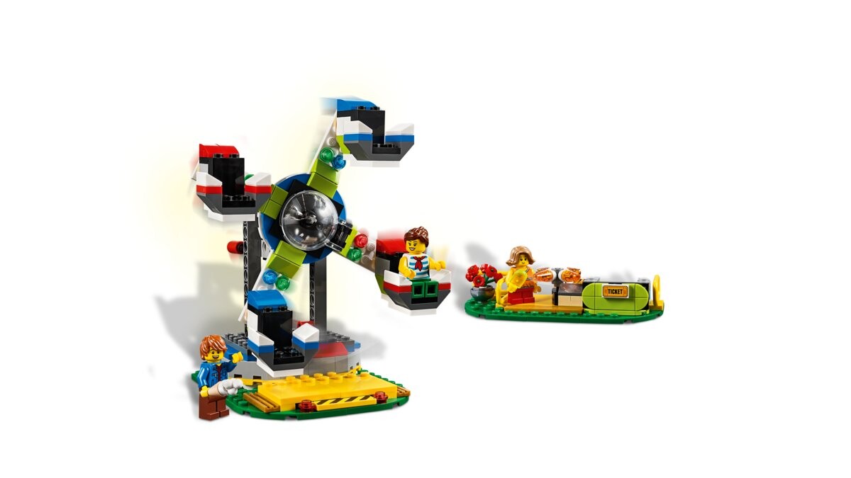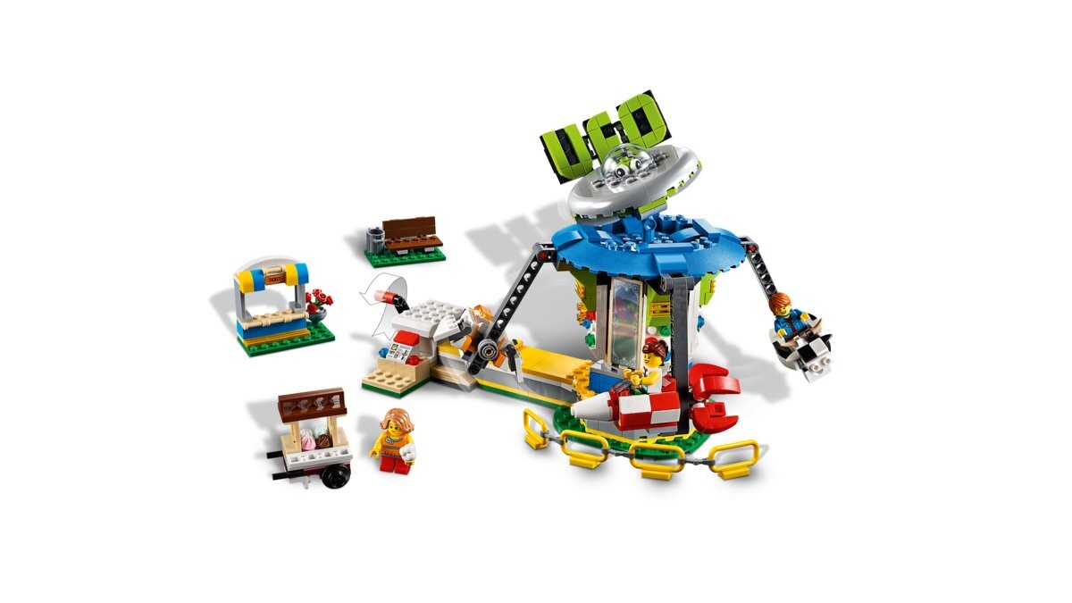 Проведите веселый день в парке развлечений с набором «Карусель для парка развлечений» LEGO Creator 3 в 1. Здесь есть потрясающая космическая карусель с крутой вывеской в форме НЛО, а также билетная касса, тележка с мороженым и скамейка. Выбирайте один из четырех подвесных экипажей: ракету, космический челнок, инопланетный корабль или забавную пятнистую корову. Затем поверните красную ручку и наблюдайте, как они поднимаются в воздух и карусель начинает вращаться! После поездки карусель можно перестроить в башню свободного падения или чудесное колесо обозрения. В парке развлечений у вас никогда не закончатся эмоции! Откройте для себя самый большой аттракцион парка развлечений: карусель 3-в-1! Испытайте волшебные приключения в парке развлечений с набором «Карусель для парка развлечений» LEGO Creator 3in1 31095. Там вы найдете космическую карусель с табличкой в виде НЛО и билетную кассу. тележка с мороженым и скамейка. Дети могут выбрать одну из четырех подвесных карет: ракету, космический челнок, корабль пришельцев или забавную пятнистую корову. Затем просто поверните красную ручку и наблюдайте, как вагоны поднимаются в воздух, а карусель начинает вращаться. С помощью этого набора LEGO Creator 3 в 1 дети смогут построить три разных аттракциона в парке развлечений. Карусель можно перестроить в башню свободного падения или колесо обозрения LEGO. В набор входят три минифигурки, готовые играть в парке развлечений.