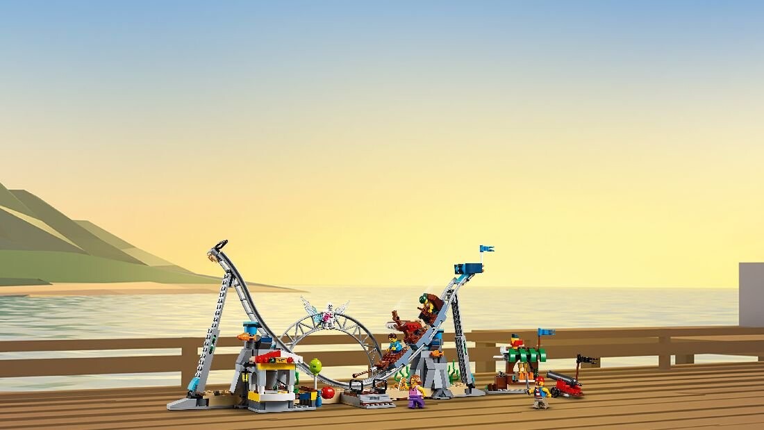 Купите билет в кассе и приготовьтесь к аттракционам набора «Пиратские американские горки» LEGO Creator 3in1 (31084)! Садитесь в поезд акул и держитесь крепче. Пойдем! Пригнитесь, чтобы не удариться о череп, прыгните за поворот над затонувшим галеоном и следите за водометом, когда скатитесь вниз. Наконец, проедьте через водную завесу — и не забудьте улыбнуться для фото! Когда закончишь кататься на американских горках перестройте модель и продолжайте веселиться в парке развлечений на леденящих кровь американских горках с черепом или осмелитесь попробовать незабываемые американские горки-корабли! Развлекайтесь в парке развлечений с набором «Пиратские американские горки» 3 в 1!