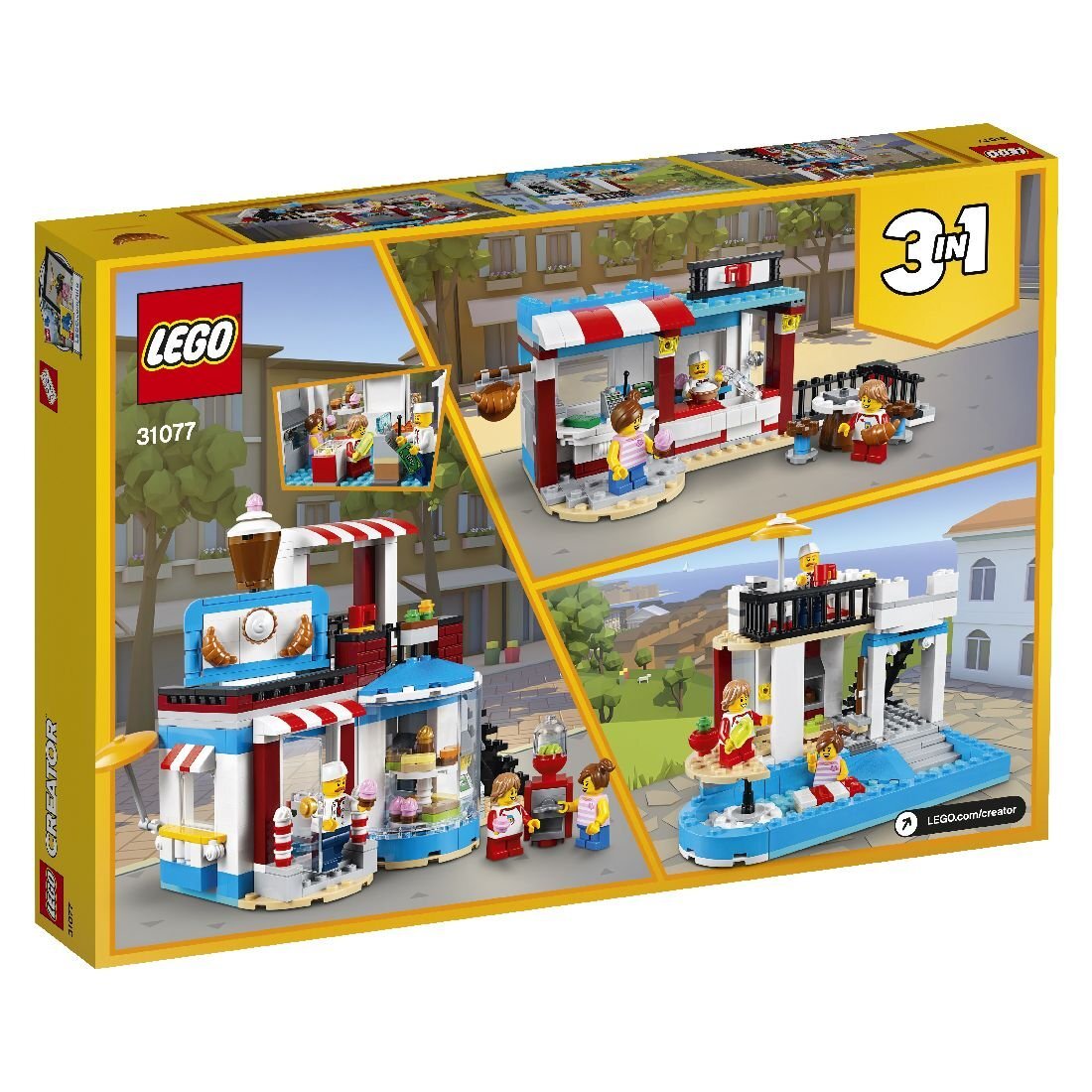 Откройте уютную пекарню LEGO с красочным фасадом, тремя навесами в красно-белую полоску и крутой вывеской! С набором LEGO Creator 3in1 «Сладкие сюрпризы 3в1» вы сможете приготовить красивые кексы и другую выпечку, разместить их на вращающейся витрине в большом эркере или подать их голодным покупателям вместе с напитками и мороженым со стенда. Затем выберите любимую закуску и поднимитесь по лестнице на террасу на крыше, чтобы отдохнуть от работы. Сборные модули можно легко комбинировать и заменять, чтобы изменить внешний вид пекарни. Например, вы можете заменить окно на дверь или устроить террасу на первом этаже – все зависит от вас! И когда вам хочется внести большие изменения Вы можете перестроить этот набор 3-в-1 в другую модель и продолжить свои приключения в домике у бассейна или в кафе на углу!