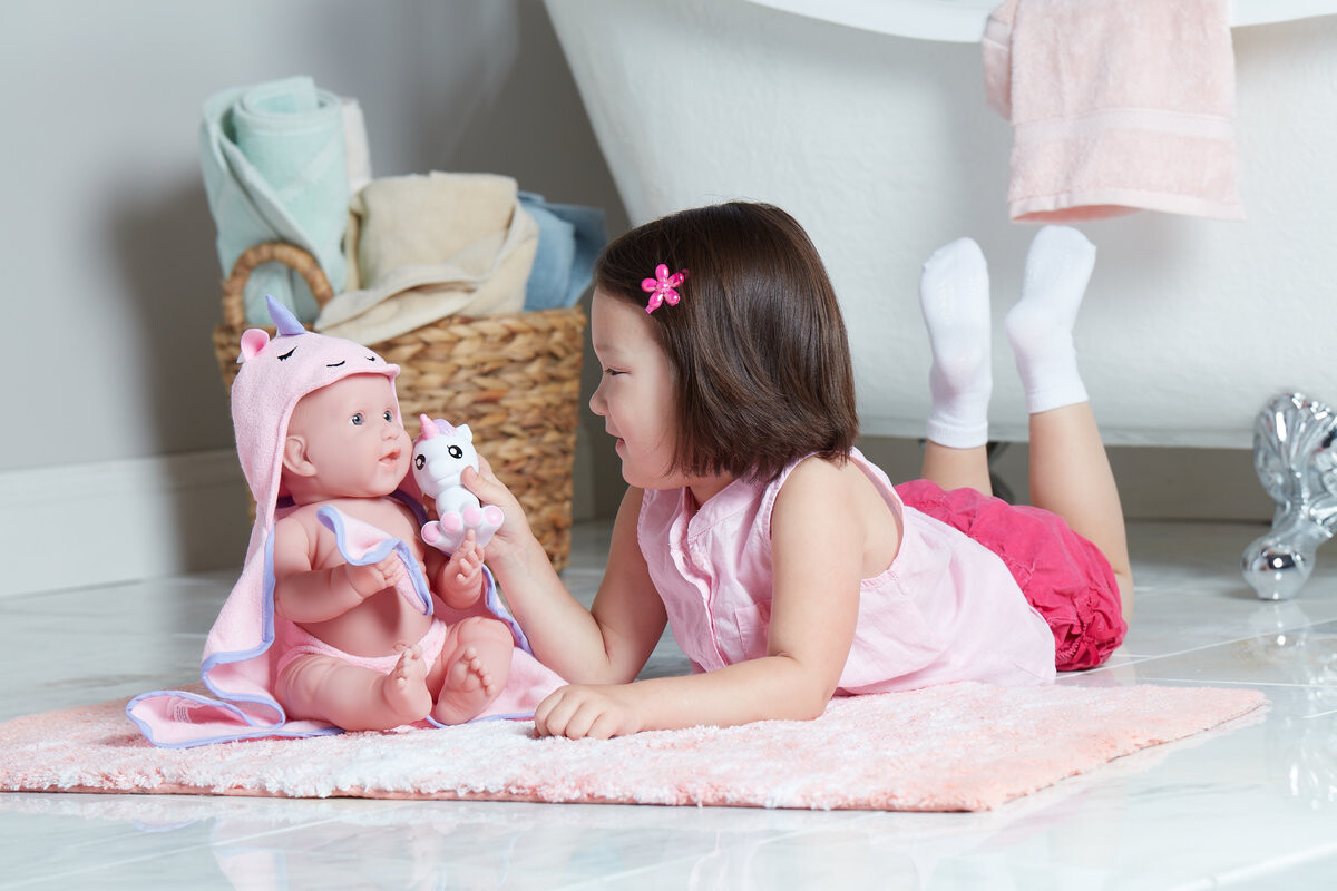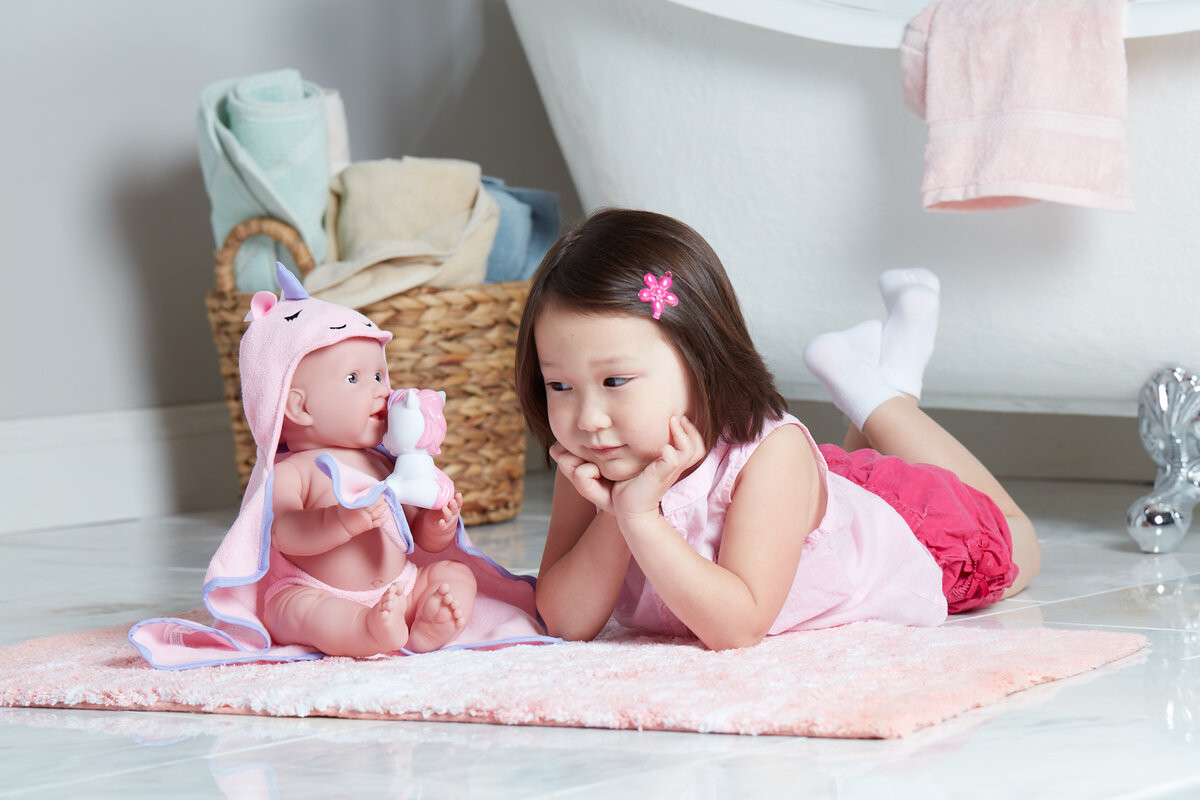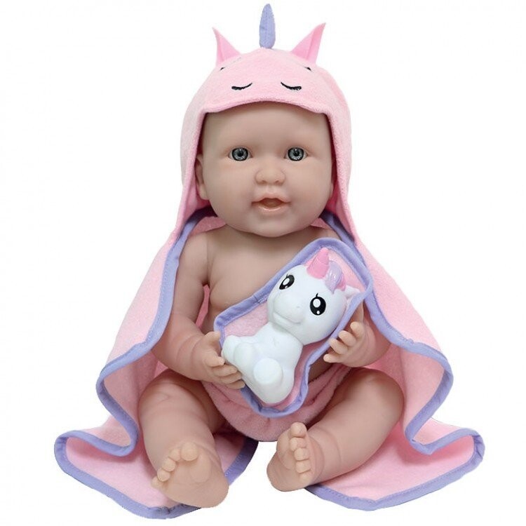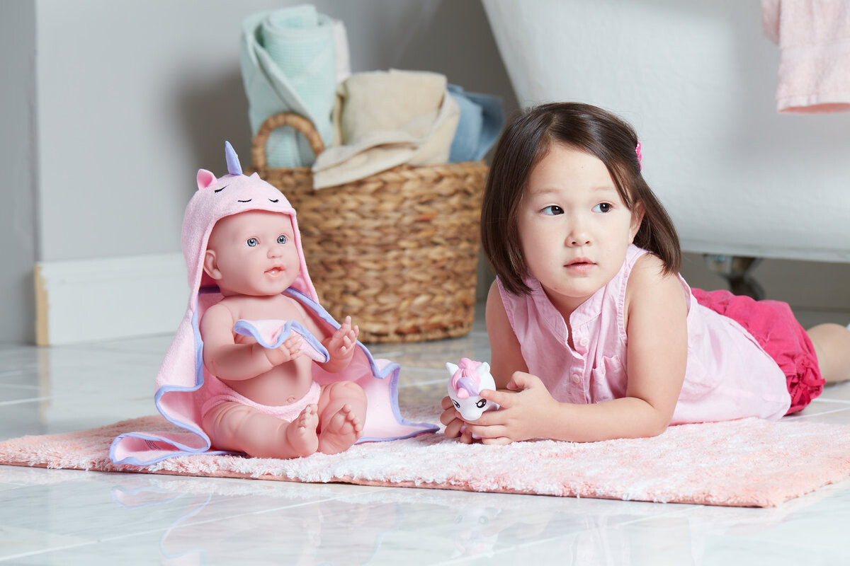 • одежда: розовые трусики и махровое полотенце с капюшоном и мотивом единорога.