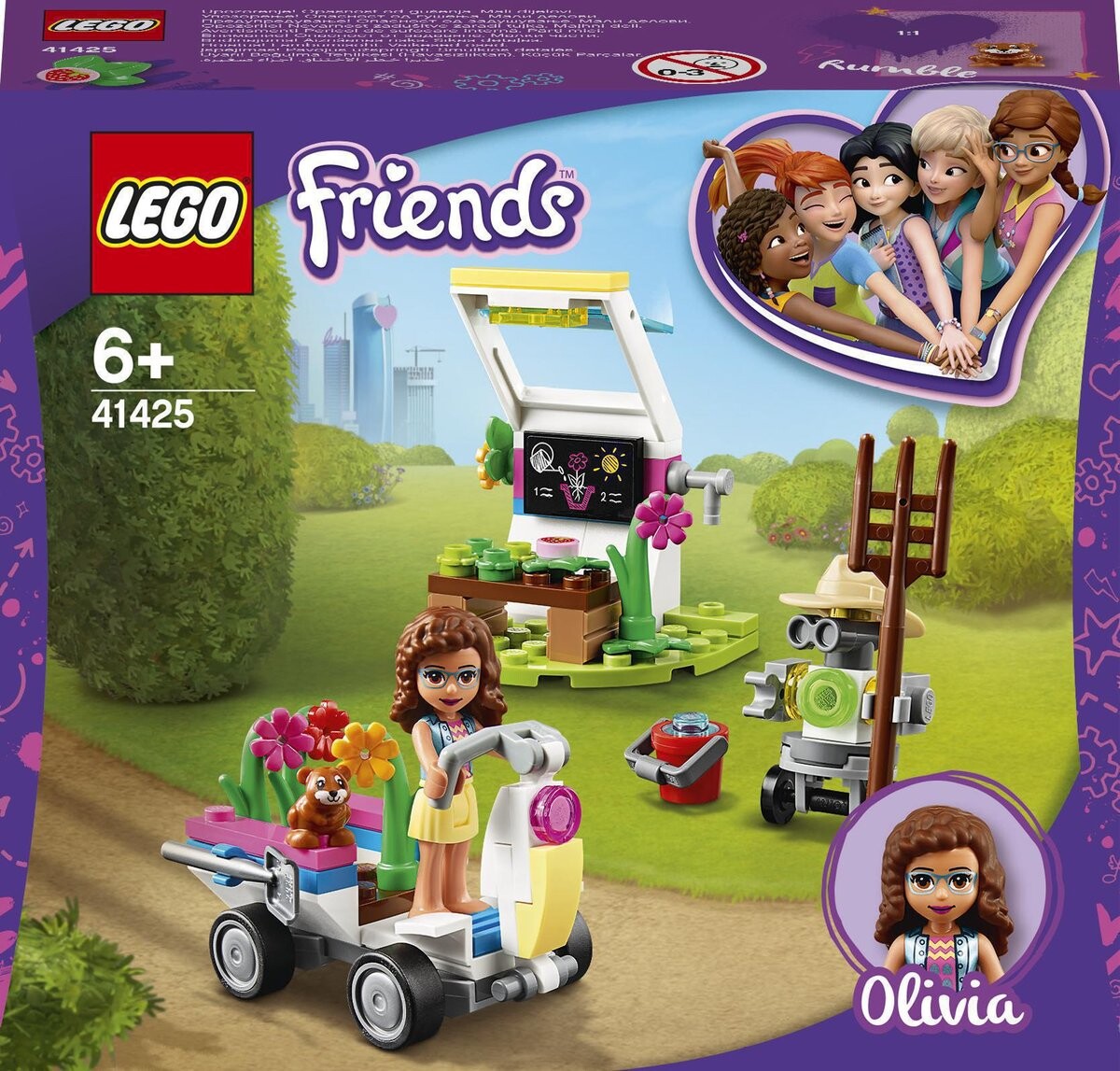 Цветочный сад Оливии LEGO Friends (41425)Набор LEGO Friends «Цветочный сад Оливии» (41425) поможет развить у детей любовь к природе. Дети могут представить, что они пошли с Оливией искать редкие цветы и одновременно исследовать местность. Они весело проведут время за рулем игрушечного транспорта, а когда вернутся в оранжерею Оливии, смогут помочь роботу Зобо LEGO Friends позаботиться о цветущих растениях с помощью садовых аксессуаров.
