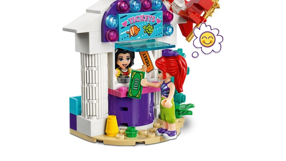 Прокатитесь на карусели «Подводные развлечения» в парке развлечений и доберитесь до облаков. Мии и Вики из LEGO Friends нужен кто-то, кто поможет им купить билеты и подняться по лестнице туда, где начинается поездка. Поверните ручку, чтобы повернуть и покачать сиденья, а затем наблюдайте, как ваши друзья поднимаются выше, откуда открывается потрясающий вид на Хартлейк-Сити. На каждом сиденье могут поместиться три мини-куколки, поэтому девочки могут сидеть вместе, если им нужно немного больше смелости. Из бутылки сладкого сока сделайте огромную сладкую вату и подарите девочкам в награду за их храбрость. Вся эта поездка вызовет у вас головокружение! Отправьтесь в парк развлечений на карусели «Подводные развлечения». Позвольте своему ребенку испытать веселье в парке развлечений с набором LEGO Friends (41337 «Подводные развлечения»). Реалистичные функции такие как киоск, где можно купить билеты, квитанции и монеты, позволяют воссоздать атмосферу настоящего парка развлечений. Детям понравится поворотная ручка, с помощью которой можно поворачивать и трясти сиденья, на которых находятся три фигурки мини-кукол LEGO. Еще больше разнообразить веселье можно, сыграв роль продавца сладкой ваты и представив, как весело делать липкие розовые конфеты. Гигантский краб на крыше киоска, а также сиденья в форме черепахи и рыбы придают этому тематическому парку LEGO морскую атмосферу и прекрасно смотрятся на полке в спальне. В этот забавный набор входят две фигурки мини-куколок: Мии и Вики из LEGO Friends.