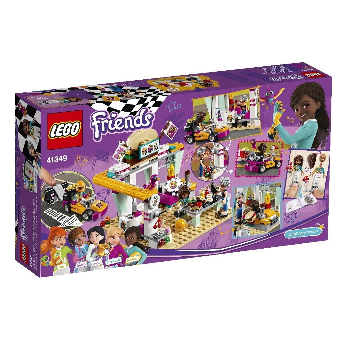 После долгого дня гонок на картинге Андреа загляните в паб, оформленный в стиле 1950-х годов. В комплект входит гоночный ресторан LEGO Friends (41349). Закажите гамбургер и картошку фри у Дотти, работающей на гриле, заплатите на кассе и сядьте на классную скамейку в форме автомобиля. А может, вы предпочитаете подъехать к одному из столиков в автокинотеатре и посмотреть там интересный фильм? Ты даже можешь разместить свой телефон или планшет перед экраном кинотеатра, чтобы показывать своим мини-куколкам настоящие фильмы из этого великолепного набора LEGO Friends!