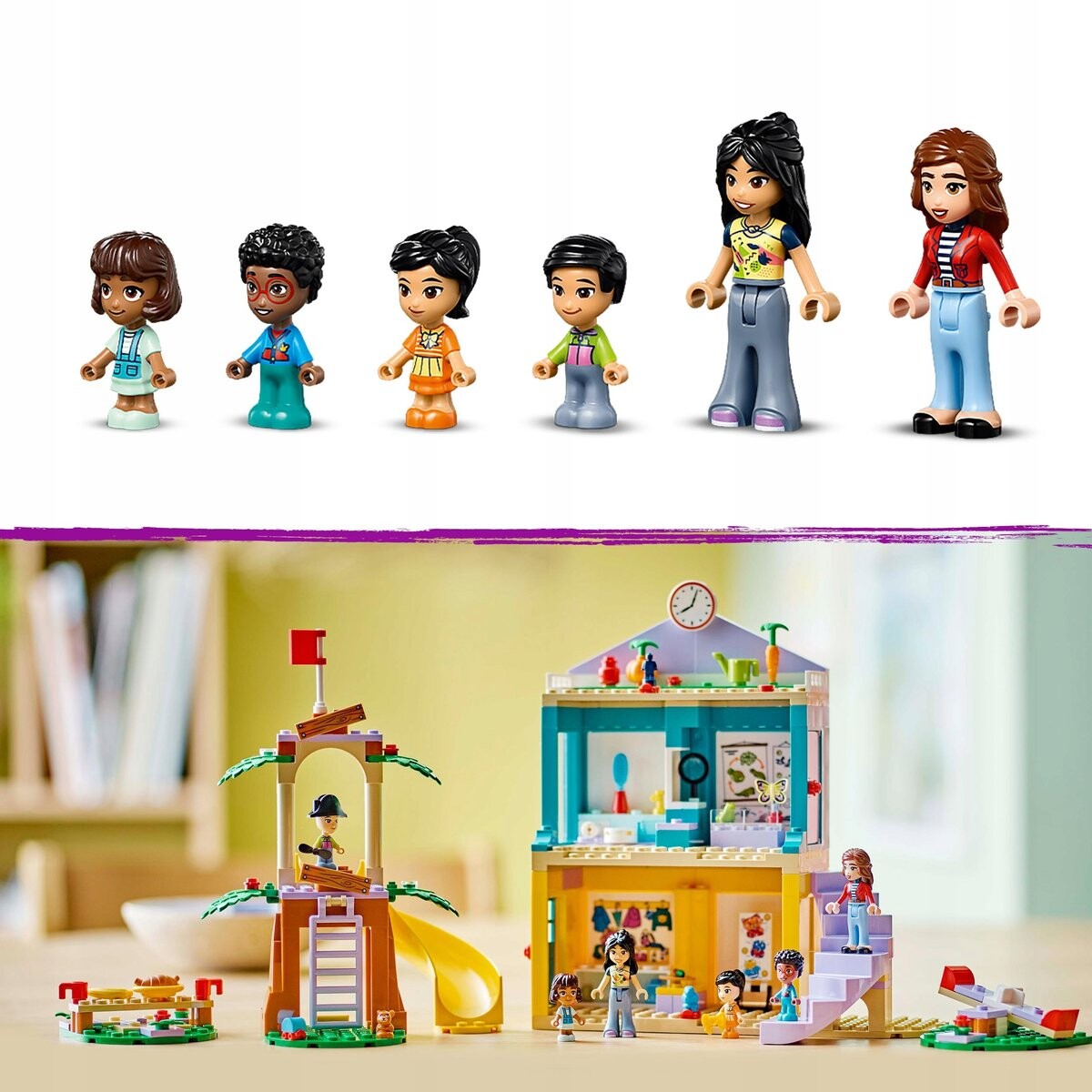 Эта игрушка для социального развития полна деталей, вдохновленных настоящим детским садом. На занятиях вы сможете узнать интересные факты о природе и жизненных циклах. откройте для себя разные эмоции в зоне рисования или весело проведите время на качелях и горках. Когда приходит время перекусить, друзья собираются за столом для пикника, а затем идут в сад на крыше, чтобы полить овощи. С наборами LEGO Friends 4+ дети смогут быстро и легко собирать модели.