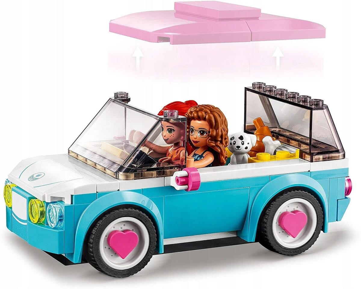 В комплект входит электромобиль в котором есть место для кукол Мии и Оливии, кроме того, на заднем сиденье есть место для щенка Эллиота. Набор новый от LEGO. Он показывает девочкам, как просто заботиться об окружающей среде, а автомобиль не должен выбрасывать в атмосферу токсичные выхлопные газы!Размеры элементов