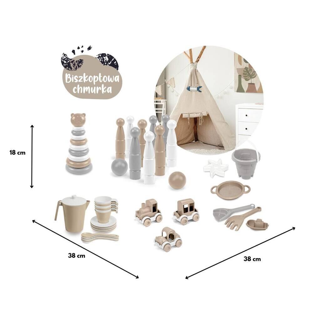 Пирамидка «Мишка Тедди» светло-бежевого, молочно-серого и белого цветов состоит из основания со стойкой, на которую ребенок кладет круги разного размера, в порядке от самого большого к самому маленькому, и, наконец, кладет последний элемент — голова плюшевого мишки, венчающая все здание. Во время игры ребенок отрабатывает точные движения рук. зрительно-моторная координация, необходимая для выполнения основных действий и обучения письму, а также развивает чувство логического мышления.