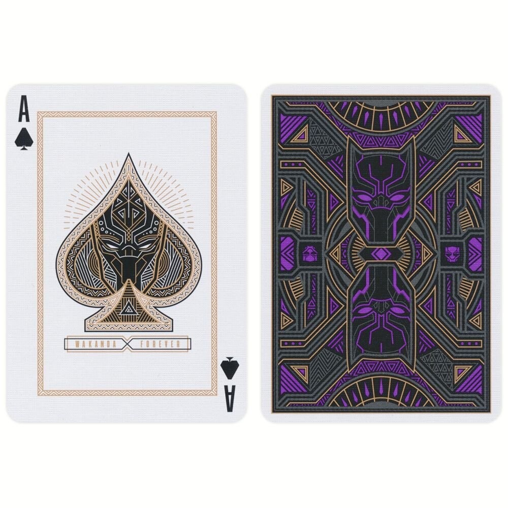 Игральные карты «Черная Пантера» — это красиво оформленный набор карт, вдохновленный культовым фильмом Marvel «Черная Пантера». Эти карты выполнены в элегантной черной цветовой гамме с металлическими серебристыми и фиолетовыми акцентами, отражающими футуристический и технологически продвинутый мир Ваканды. На обратной стороне карточек изображен геометрический узор, включающий элементы, вдохновленные костюмом Черной пантеры и культурой Ваканды.