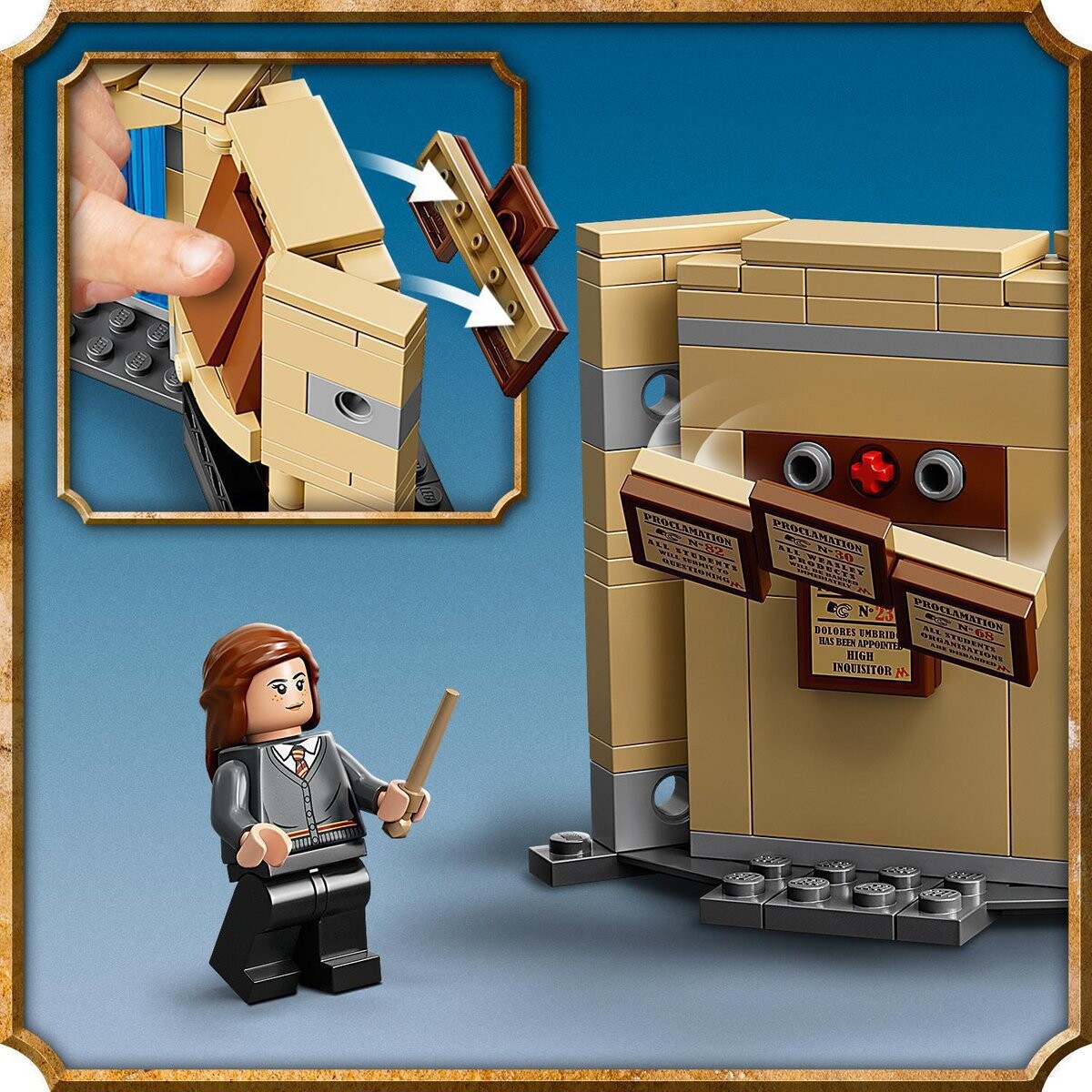 - В комплект входят 3 минифигурки Гарри Поттера с палочками. Гермиона Грейнджер и Луна Лавгуд — два животных-Патронуса, силовой стрелок, механический манекен Пожирателя Смерти и детально проработанная комната с колонной, мемориальной доской и камином.