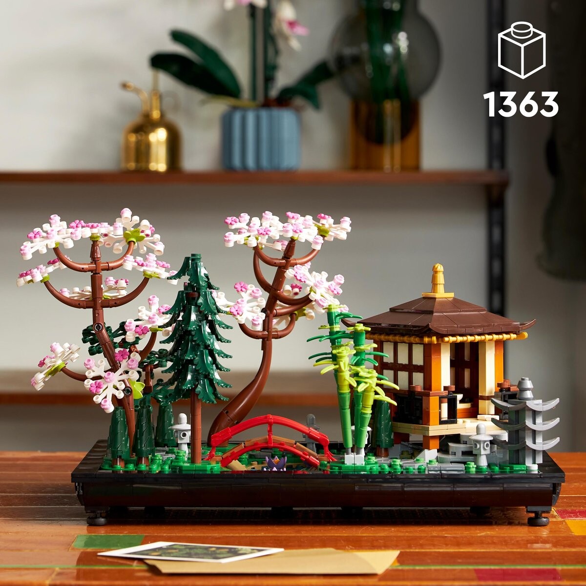 Вот ваше убежище в японском стиле с павильоном, мостом, ручьем, кои, цветами лотоса, деревьями, камнями и фонарями.LEGO Icons Тихий садКоллекционная модель