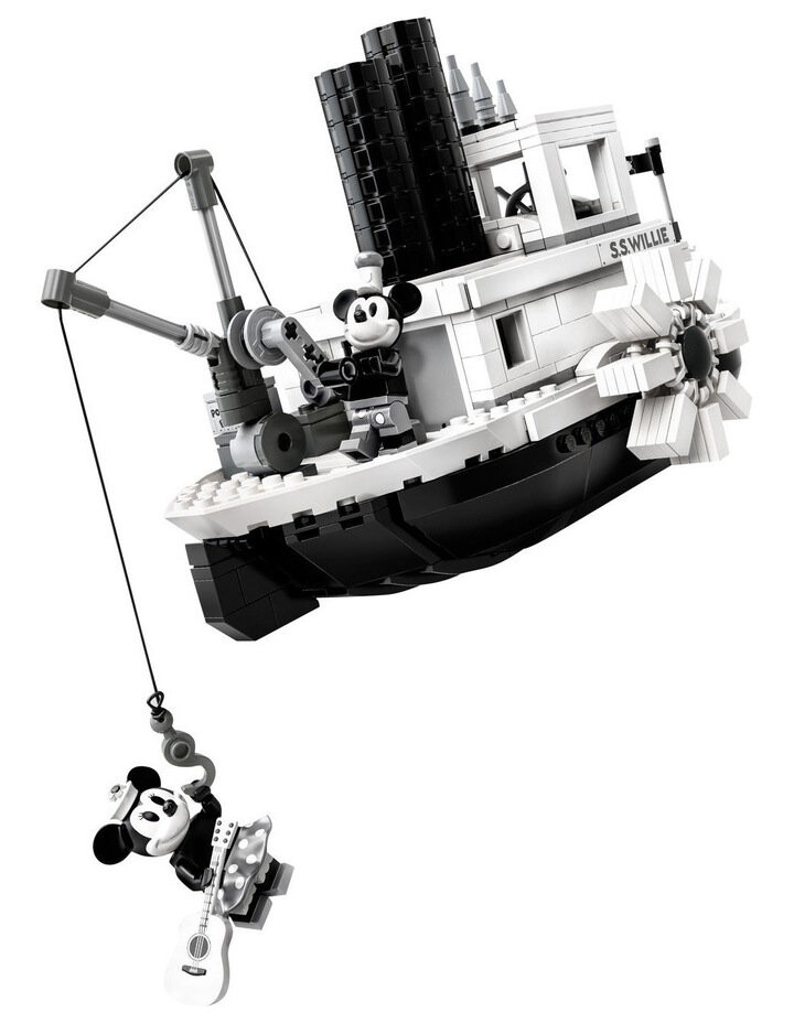 Поклонникам Диснеевского Микки Мауса понравится набор LEGO Ideas 21317 «Пароход Вилли, посвященный 90-летию». день рождения этого самого известного мультперсонажа в мире. Микки Маус дебютировал в кино в 1928 году в черно-белом короткометражном мультфильме «Пароходик Вилли». Это также был первый фильм Диснея со звуком. Модель знаменитого парохода LEGO оснащена паровыми трубами, которые движутся вверх и вниз, и гребными колесами, которые вращаются при движении корабля. На мостике есть место для минифигурки и морских деталей, вдохновляющих на игру, в том числе рулевого колеса, спасательного круга и сборного колокола. Также на борту имеется рабочий кран. с помощью которого можно поднять «картофельный ящик». В этот удивительный набор также входят минифигурки Микки Мауса и Минни Маус с серебряными принтами (новинка апреля 2019 года) и фигурка попугая. Это идеальный выбор для детей и взрослых, которые мечтают разыграть сцены из оригинального мультфильма о Микки Маусе или просто хотят собрать и продемонстрировать эту классную монохромную модель LEGO.