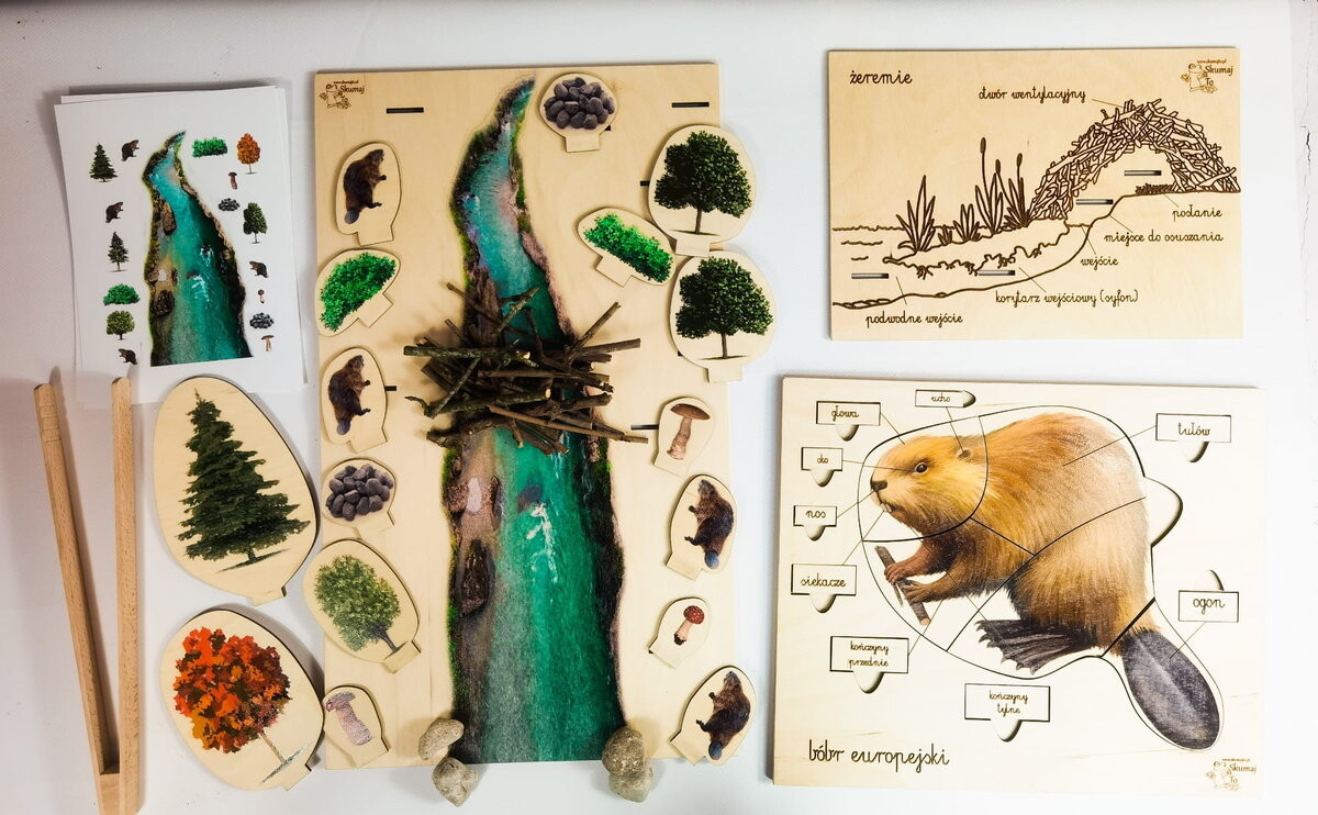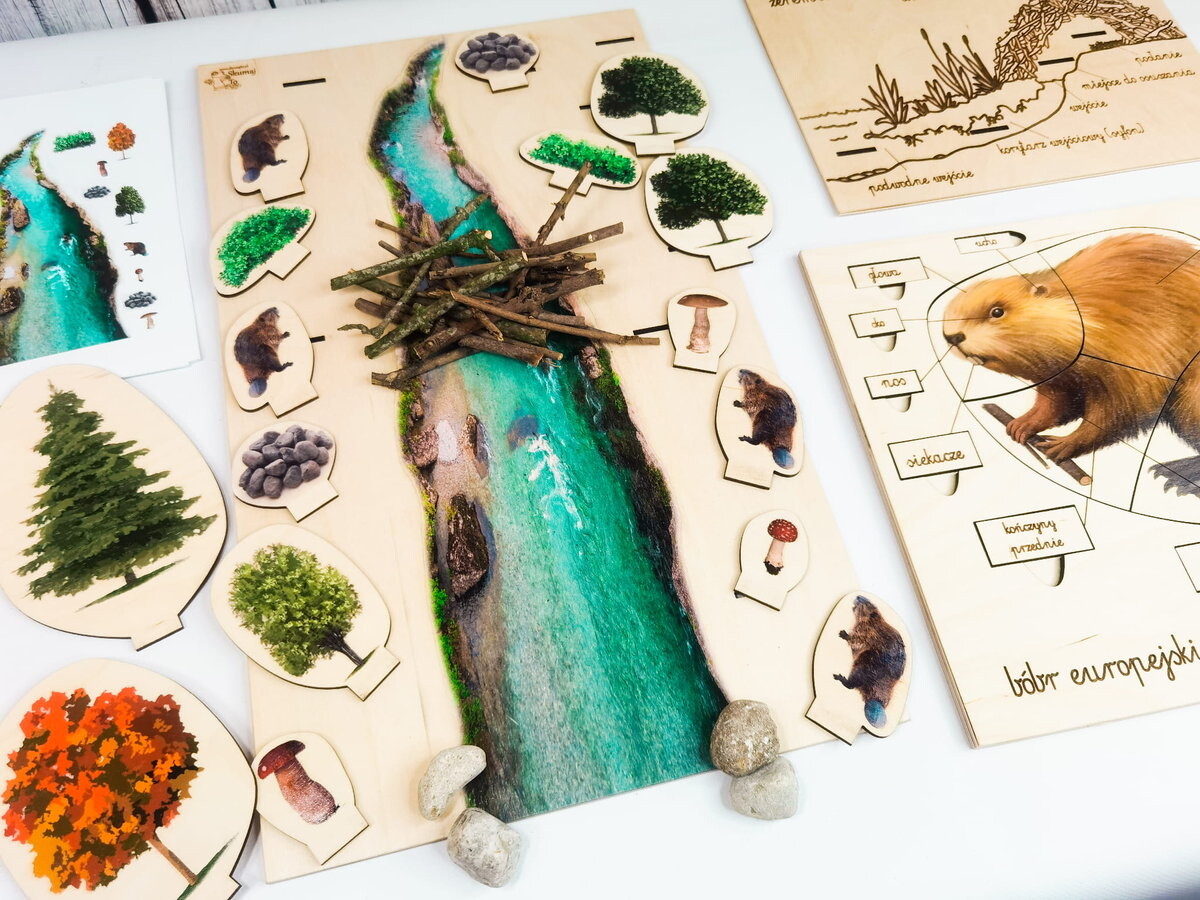 - Река:большая доска с напечатанной на ней рекой, вокруг которой живут 4 бобра. Задача ребенка – воспроизвести отдельные элементы леса по прикрепленным карточкам. Кроме того, вы можете тренировать пространственную ориентацию и практиковать такие понятия, как «рядом, между, перед «за» и весело отгадывайте недостающие элементы.