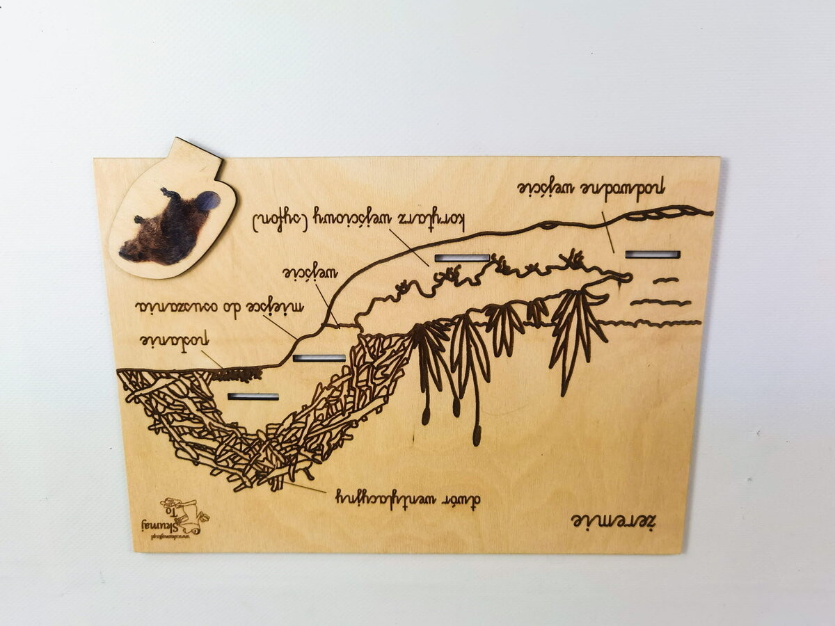 - Строение бобра:Основа с бобром и описаниями отдельных частей его тела. Под бобром спрятан его скелет, на котором видны все кости животного.