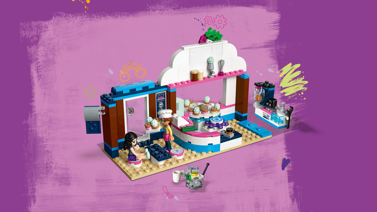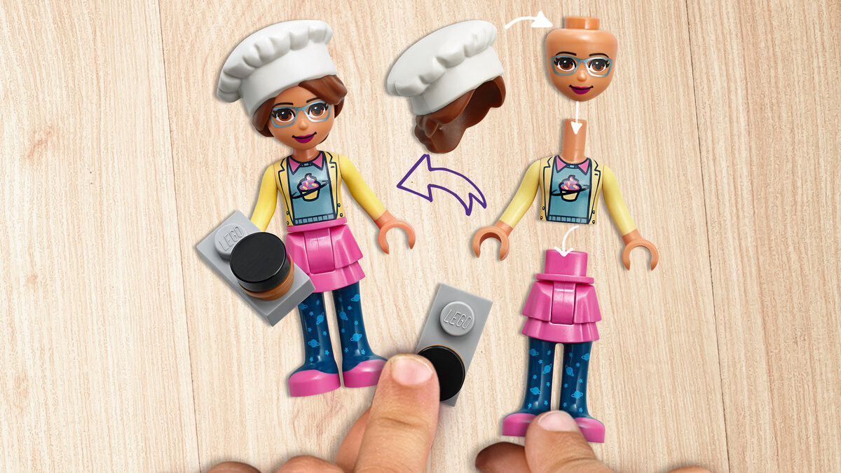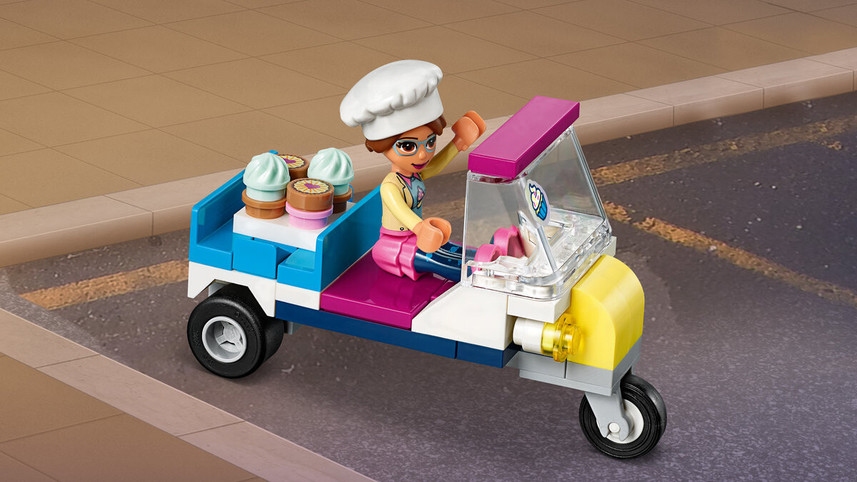 В воздухе вкусно пахнет – это свежеиспеченные кексы! Помогите LEGO Friends Оливии в ее недавно открытой пекарне. Посмотрите, какие удивительные технологические приспособления она изобрела, чтобы облегчить выпечку.
