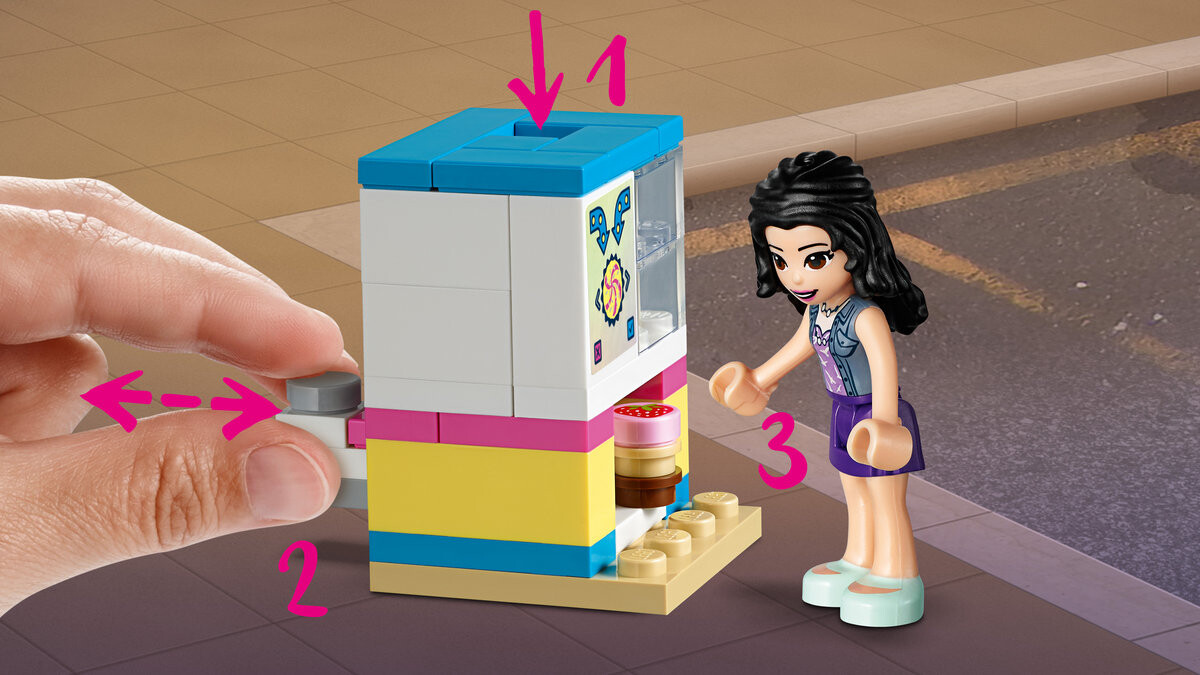 Выбирайте самую вкусную выпечку на вращающемся противне или приготовьте свои собственные деликатесы в сумасшедшем автомате для раздачи кексов. Помогите роботу Зобо подать Эмме LEGO Friends у автомата для раздачи молока и на кассе. Пришло время засучить рукава - похоже, Оливии не помешала бы помощь на кухне... Подожди, что это за запах? Кексы подгорели! Сохраните самые вкусные и загрузите их на свой самокат для продажи по всему Хартлейк Сити.