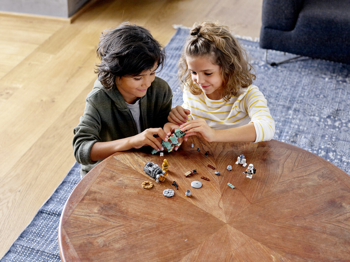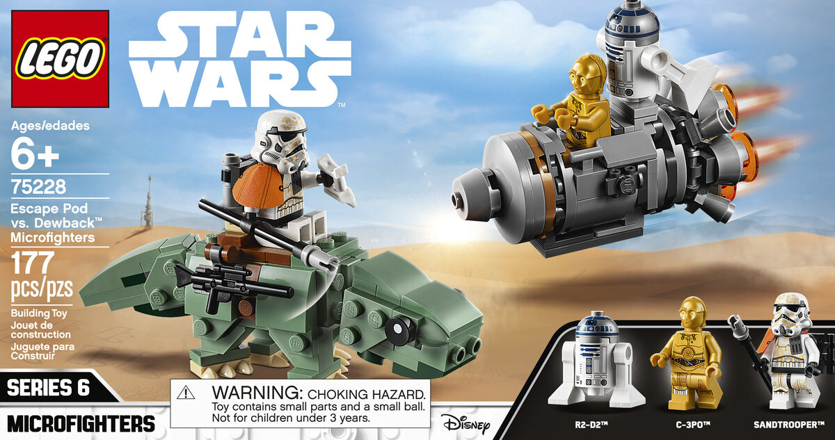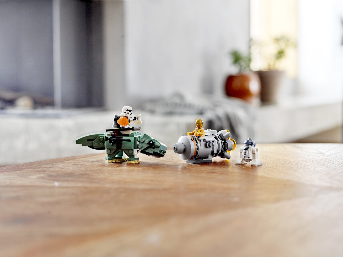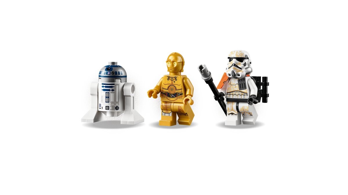 Дроиды C-3PO и R2-D2 разбились в спасательной капсуле! Помогите им спрятаться до того, как их заметит штурмовик пустыни на «Дьюбэке». От этого зависит судьба всей галактики! Соберите этот забавный набор из двух микроистребителей LEGO Star Wars с C-3PO, R2-D2, пустынным штурмовиком и дроидами Дьюбэк. Отправляйтесь в незабываемые приключения с набором из 2 «Спасательной капсулы против микроистребителя Дьюбек» LEGO Star Wars (75228). В набор входит спасательная капсула с большим детализированным двигателем и местом для фигурок дроидов LEGO C-3PO и R2-D2, а также сборная фигурка росы. У животного есть подвижная голова и хвост, места для крепления оружия и место для минифигурки штурмовика сверху. Отдельные инструкции по сборке каждой модели позволят поклонникам «Звездных войн» собрать этот полезный набор вместе с семьей или друзьями.