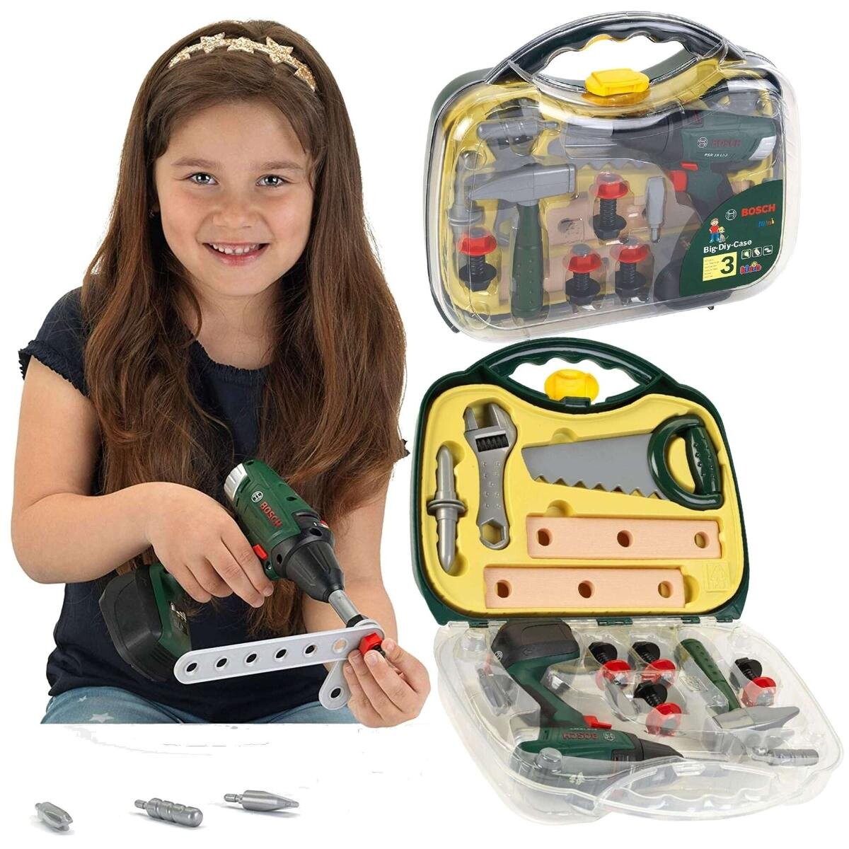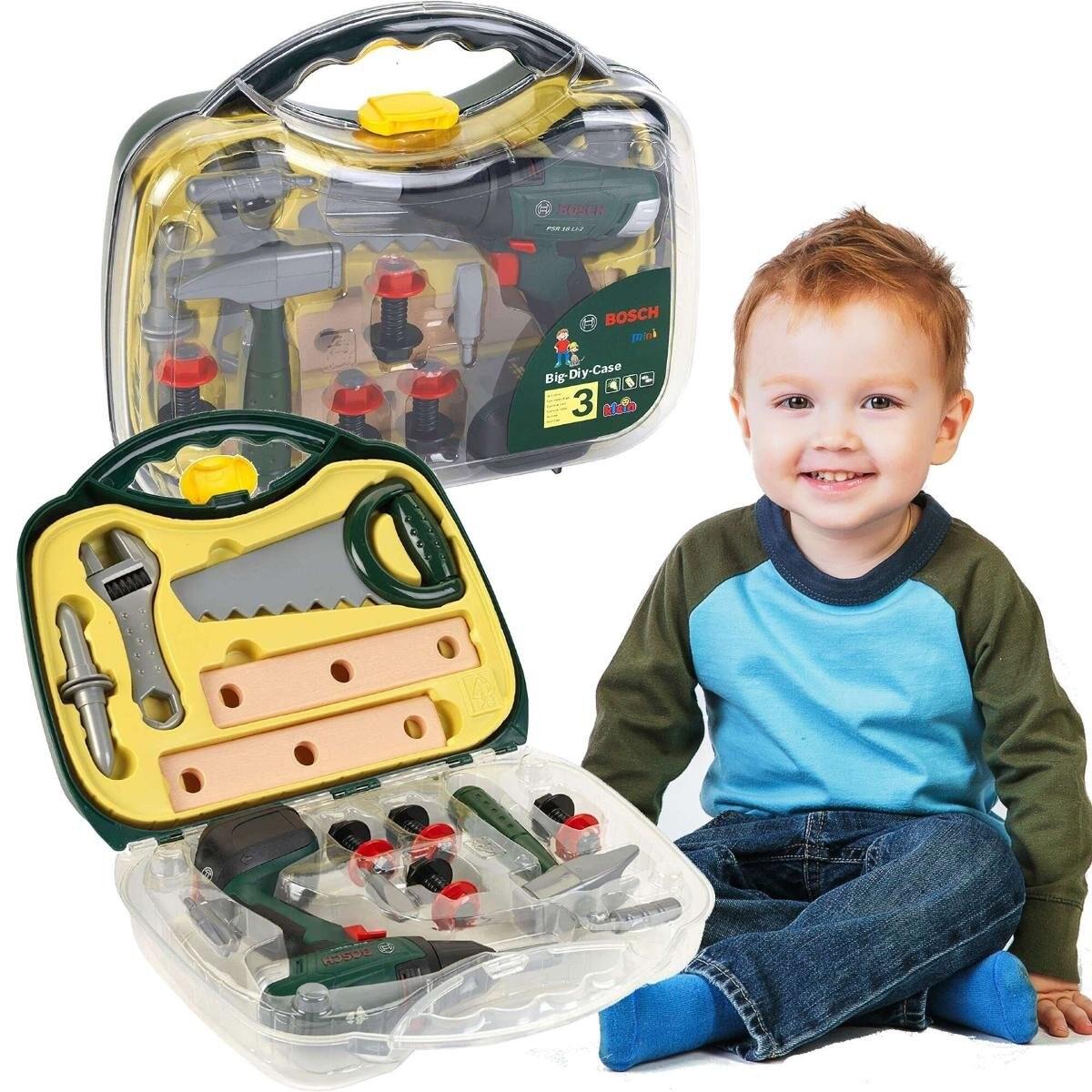 Внутри чемодана можно найти все, что нужно маленькому любителю DIY - отвертку, гаечный ключ, молоток, четыре больших черных шурупа, два гвоздя, две специальные полоски с отверстиями для вкручивания шурупов и самое главное. - отвертка Bosch, являющаяся точной имитацией своего настоящего аналога.