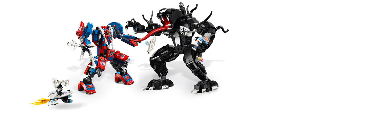 Помогите Человеку-пауку и Пауку-призраку спасти тетю Мэй из лап огромного робота Венома! Стреляйте в злодея пауками и паутиной из робота-паука. Будьте осторожны с роботом Веномом — у него ядовитые когти и язык. Стреляйте в него шипами с летающей доски Призрачного Паука. Затем навсегда остановите злого симбиота, поймав его в захват робота-паука Человека-паука. Устройте незабываемый поединок Человека-Паука и Венома! Присоединяйтесь к Человеку-пауку и Пауку-призраку, которые пытаются спасти тетю Мэй из лап Венома в захватывающем наборе LEGO Marvel Spider-Man (76115) «Механизм-паук против Венома». Подвижный робот-паук с открывающейся кабиной, в которой есть место для минифигурки, пауко-паутинный стрелок и грейфер — серьезный противник для огромного подвижного робота Венома с когтями для ловли минифигурок. В этот набор супергероев входят 4 минифигурки LEGO. Летающая доска Ghost Spider с двумя шипомётами и девятью новыми кубиками паутины, которые можно прикреплять к моделям, минифигуркам и оружию.
