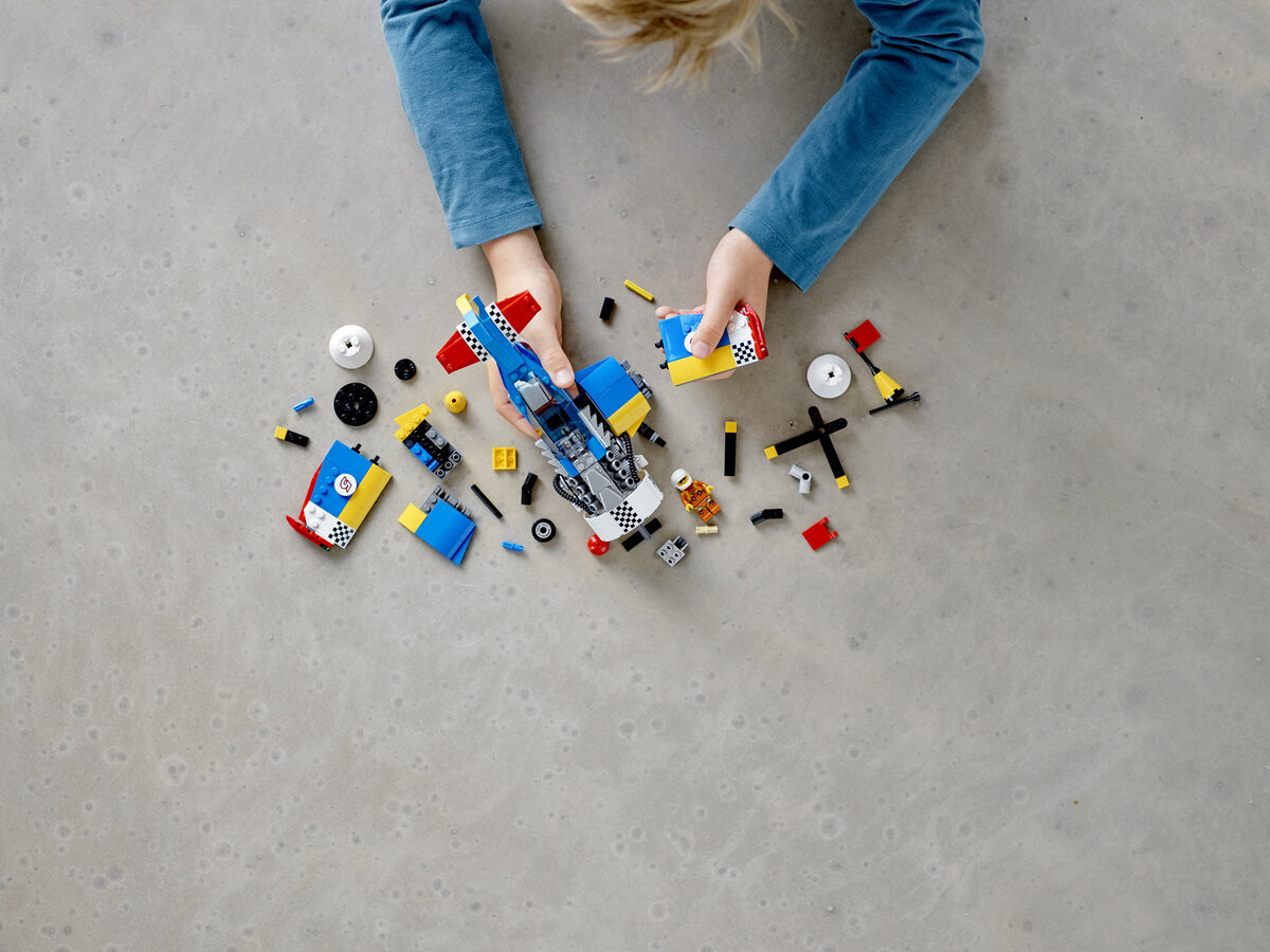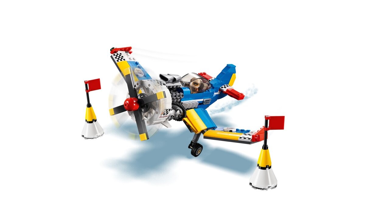 Отправляйтесь в полет на удивительном гоночном самолете 3-в-1 LEGO Creator! Модель собрана из синих, белых, желтых и красных блоков и украшена гоночными наклейками. Своим аэродинамическим видом он обязан множеству интересных деталей, таких как огромный детализированный двигатель с трубами и цилиндрами, неподвижное шасси, большой пропеллер и шарнирные крылья. Откройте тонированное окно, чтобы попасть в кабину, выставьте хвостовые элероны под нужным углом и взлетайте, чтобы поразить публику воздушной акробатикой, исполняемой на головокружительных скоростях. Закончив представление, вы сможете перестроить этот удивительный винтовой самолет в мощный вертолет с вертикальной подъемной силой или небольшой реактивный самолет для сверхзвуковых воздушных маневров. Построить гоночный самолет вертолет или реактивный самолет и перестрой их с помощью набора LEGO Creator 3 в 1! Гоняйте в стиле ретро с классическим набором LEGO Creator 3in1 31094 «Гоночный самолет». Модель собрана из синих, белых, желтых и красных блоков и украшена гоночными наклейками. У него много интересных деталей, таких как видимый двигатель с трубами и цилиндрами, фиксированное шасси, большой пропеллер, спортивные крылья с шарнирами и подвижные элероны на хвосте. Этот впечатляющий самолет также имеет открывающуюся кабину, в которой можно разместить минифигурку пилота в шлеме и комбинезоне с принтом. Набор LEGO Creator 3 в 1 позволяет собрать три разные игровые модели. Постройте винтовой самолет и перестройте его в игрушечный вертолет или реактивный самолет. чтобы испытать еще больше приключений под облаками.