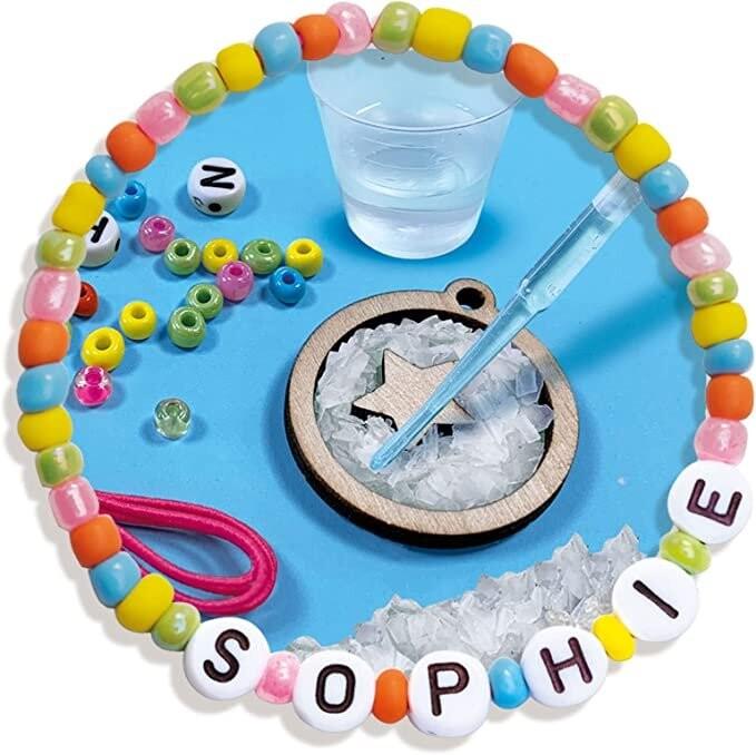 Решите, какую надпись вы разместите на своем браслете. Может быть, это будет ваше имя, а может быть, что-то еще? В наборе целых 200 бусин с буквами и дополнительные деревянные буквы, которые можно креативно вплести в браслет. Блестящая пыль придаст браслетам дополнительный блеск.