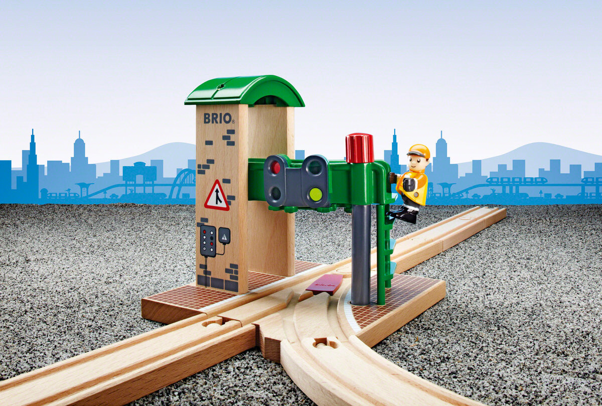 Brio 33674 Комплект «Сигнальная станция» является дополнительным элементом для путей и железных дорог Brio. Его создал бренд Brio, выпускающий наборы любимых детьми игрушек. Этот комплект состоит из станции с фонарями и стрелочного перевода для подключения к путям. С помощью красной ручки вы можете переключать световые дорожки. Эта же ручка перемещает переключатель, благодаря чему поезд с зеленым светом может двигаться дальше и поезда не сталкиваются друг с другом. В набор также входит фигурка технического персонала станции. Она одета в желтый наряд, ее можно сесть и поднять руки.