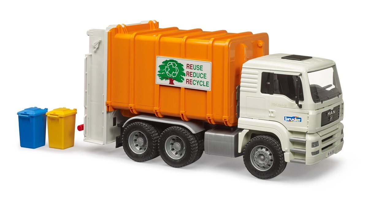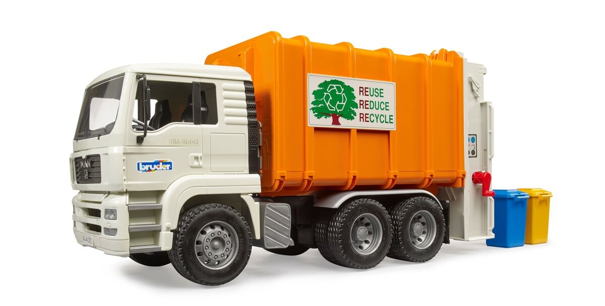 Наша новейшая машина для вывоза мусора создана на основе известной и проверенной модели MAN TGA. Кабину можно наклонять, обеспечивая обзор блока двигателя. Этот современный погрузчик с задней загрузкой доставляет мусор в камеру сжатия с помощью двух спиральных конвейеров. все как в оригинале. Опорожнение небольших мусорных баков или контейнеров для мусора в кузов автомобиля. Опорожнение кузова осуществляется с помощью открывающейся задней заслонки, которая фиксируется в конечном положении. В комплект поставки входят два мусорных контейнера; Идеальным дополнением является комплект мусорных контейнеров BRUDER (артикул: 02607 с тремя маленькими и одним большим контейнером).