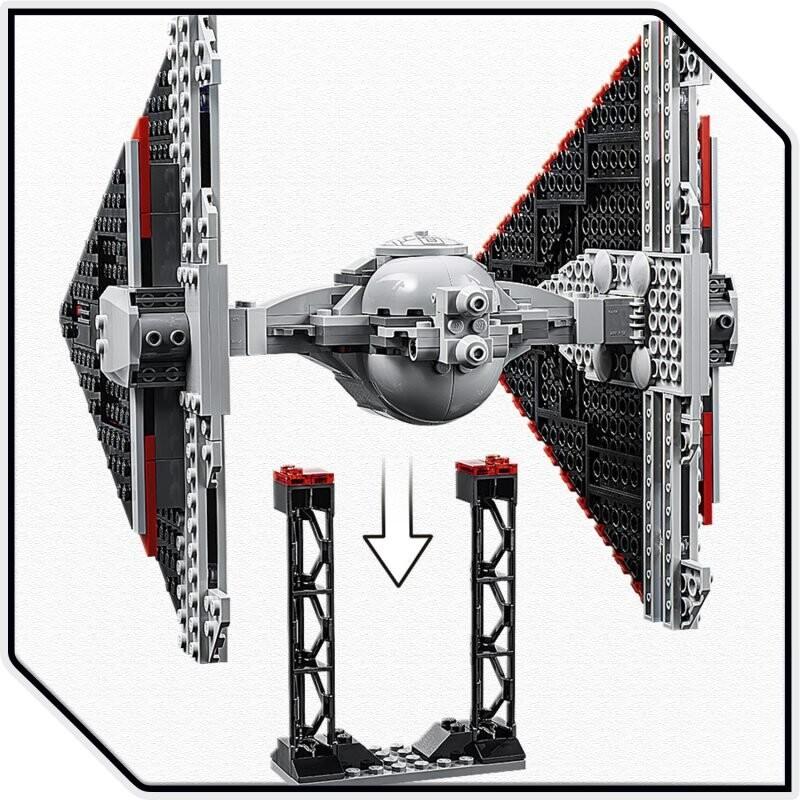 - Истребитель TIE имеет открывающуюся кабину, в которой можно разместить минифигурку, и две подпружиненные ракетные пусковые установки. В набор также входит стыковочная башня, которую можно использовать для взлета, посадки или демонстрации модели, а также 3 минифигурки для ролевых игр.