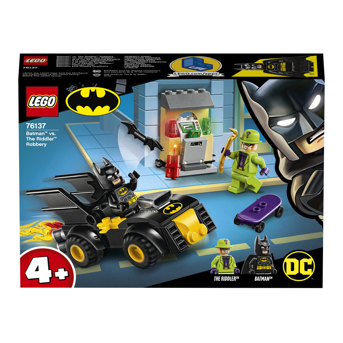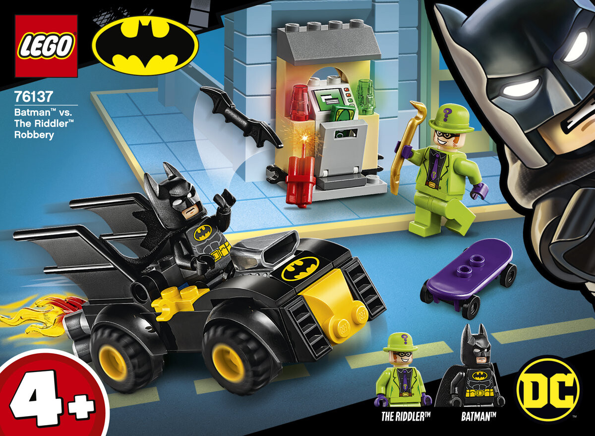 Суперзлодей украл деньги из банкомата и сбегает на своем скейтборде. Садитесь в фантастический Бэтмобиль LEGO Бэтмена и отправляйтесь в погоню на высокой скорости. Бросьте Бэтаранг, чтобы сбить Загадочника и вернуть украденные деньги! Интересный набор с машинкой Бэтмобиль для детей от четырех лет и старше! LEGO DC Batman 76137 «Бэтмен и ограбление Риддлера» знакомит дошкольников и малышей с миром героических приключений. Этот простой в сборке и безопасный образовательный набор LEGO 4+ включает в себя Бэтмобиль со специальным стартовым шасси, которое позволяет даже новичкам испытать гордость от самостоятельной сборки зданий, транспортных средств и многого другого. В комплект входят простые инструкции, которые помогут вам начать собирать и играть. и объяснят юным строителям назначение отдельных этапов строительства. Благодаря этому у детей развивается воображение и уверенность в себе. В комплект также входит сборный банкомат с местом для крепления динамита. Отличная идея подарка для поклонников Бэтмена: детям понравится создавать свои собственные истории с помощью двух минифигурок, оснащенных оружием и аксессуарами, включая сборный скейтборд Риддлера.