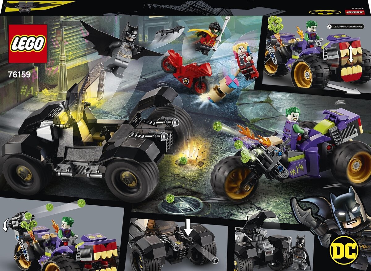 - Удивительный набор LEGO DC Batman Joker Tricycle (76159) приглашает детей погрузиться в увлекательные приключения в мире, где Бэтмен сражается с Джокером. Помимо эмоций детей ждут крутые транспортные средства, оружие и необычные функции.
