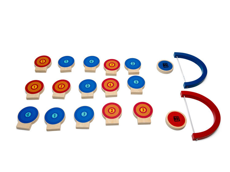 В комплект входят деревянные элементы: 15 мишеней с наконечниками (7 см), два лука (16 см) и два диска (6 см).