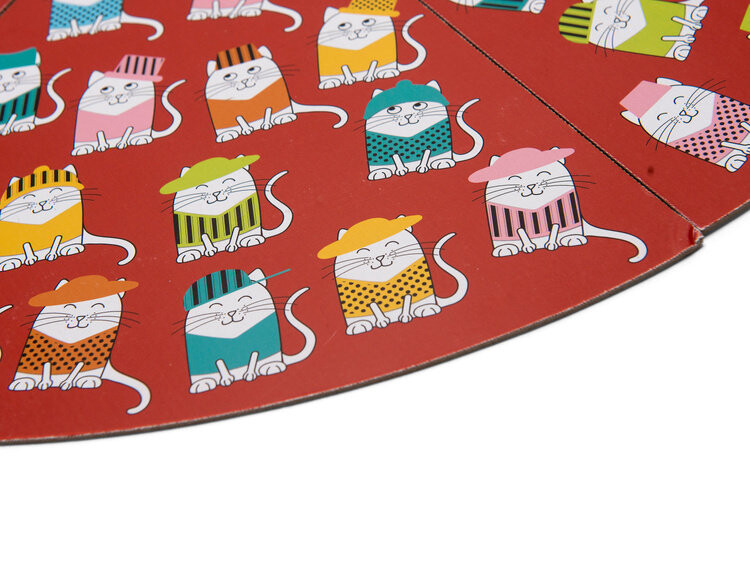 Набор состоит из следующих картонных элементов: доска «кошка» (8 пазлов) диаметром 60 см, 6 разноцветных котов (14 х 13 см), 42 пуговицы (1,5 см). большой деревянный кубик (3 см) и 4 деревянных жетона (3, 5 см)