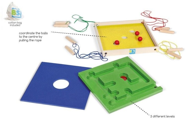 Набор, тренирующий координацию движений и работу в команде. Участники игры держат в руках деревянные палочки, прикрепленные к доске лабиринта. Игроки дают друг другу команды и предложения по перемещению доски так, чтобы шарик катился по лабиринту и попадал в отверстие доски.
