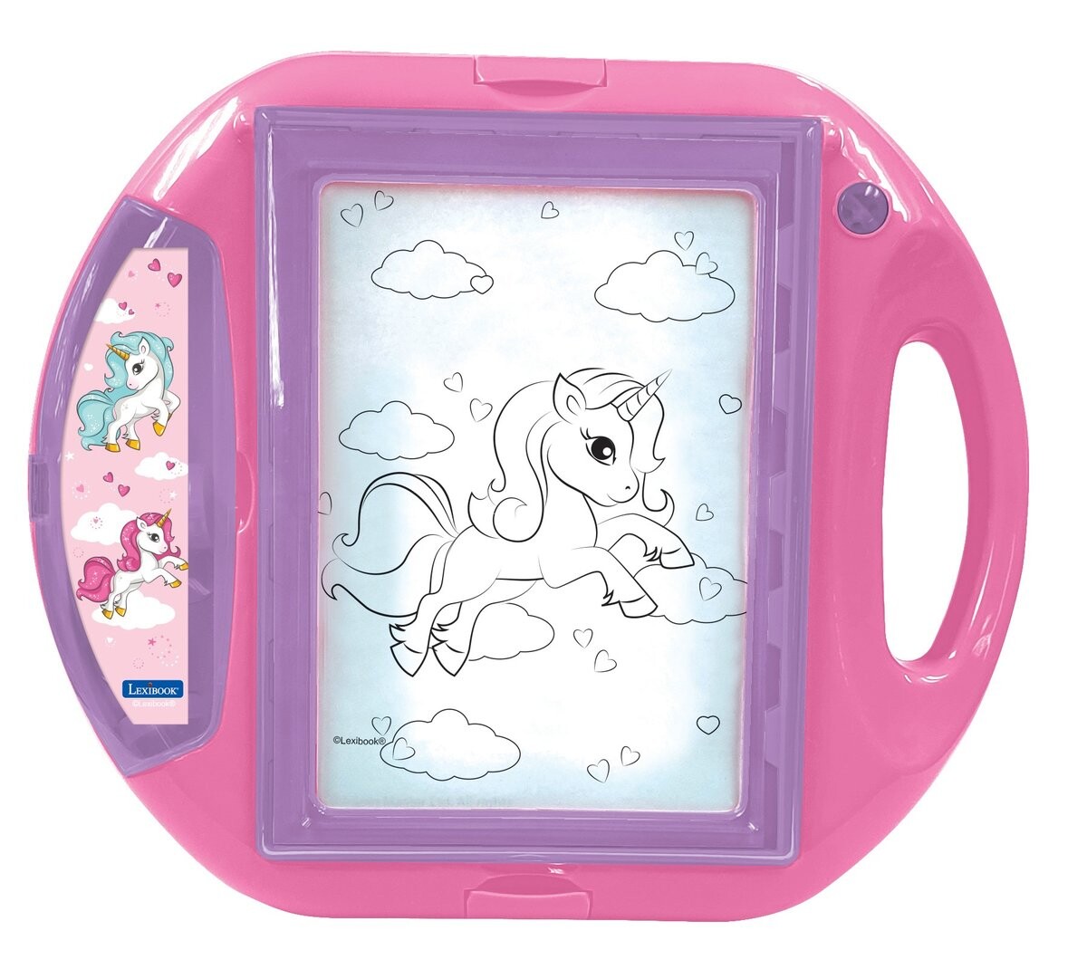 * Фантастический проектор для рисования с экраном А5, 10 трафаретами и 4 штампами единорогов, позволяющий научиться рисовать, развлекаясь. Очень простой в использовании благодаря светящемуся экрану и практичной настройке, этот проектор открывается, чтобы хранить все ваши аксессуары и носить его куда угодно.