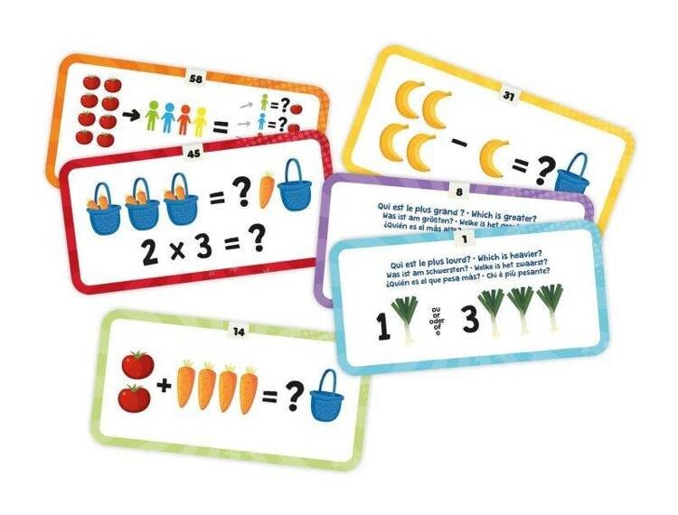 Дети постарше научатся считать в игре. Чтобы найти решения 30 карточек с задачами, детям нужно повесить гири, чтобы сбалансировать весы и найти правильный