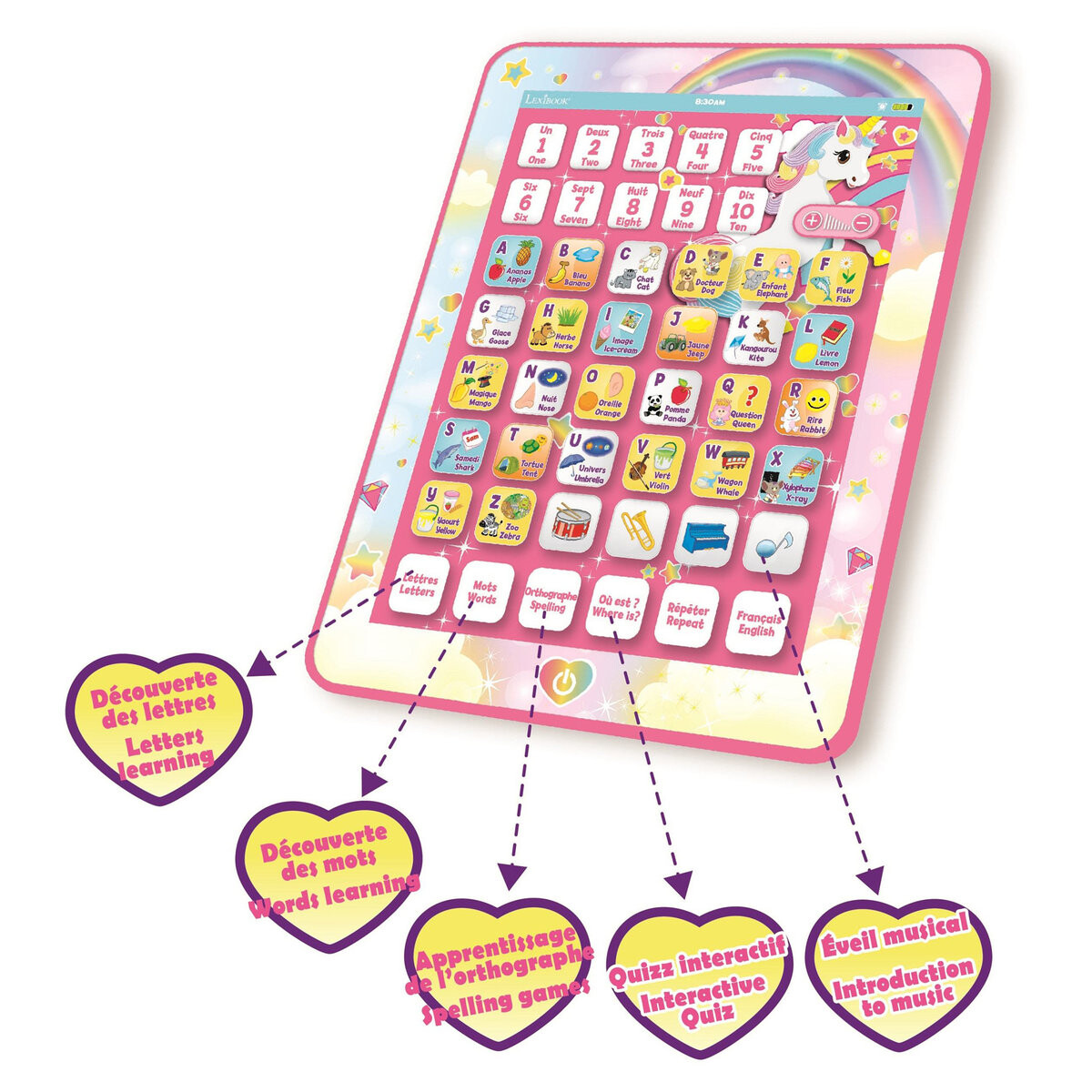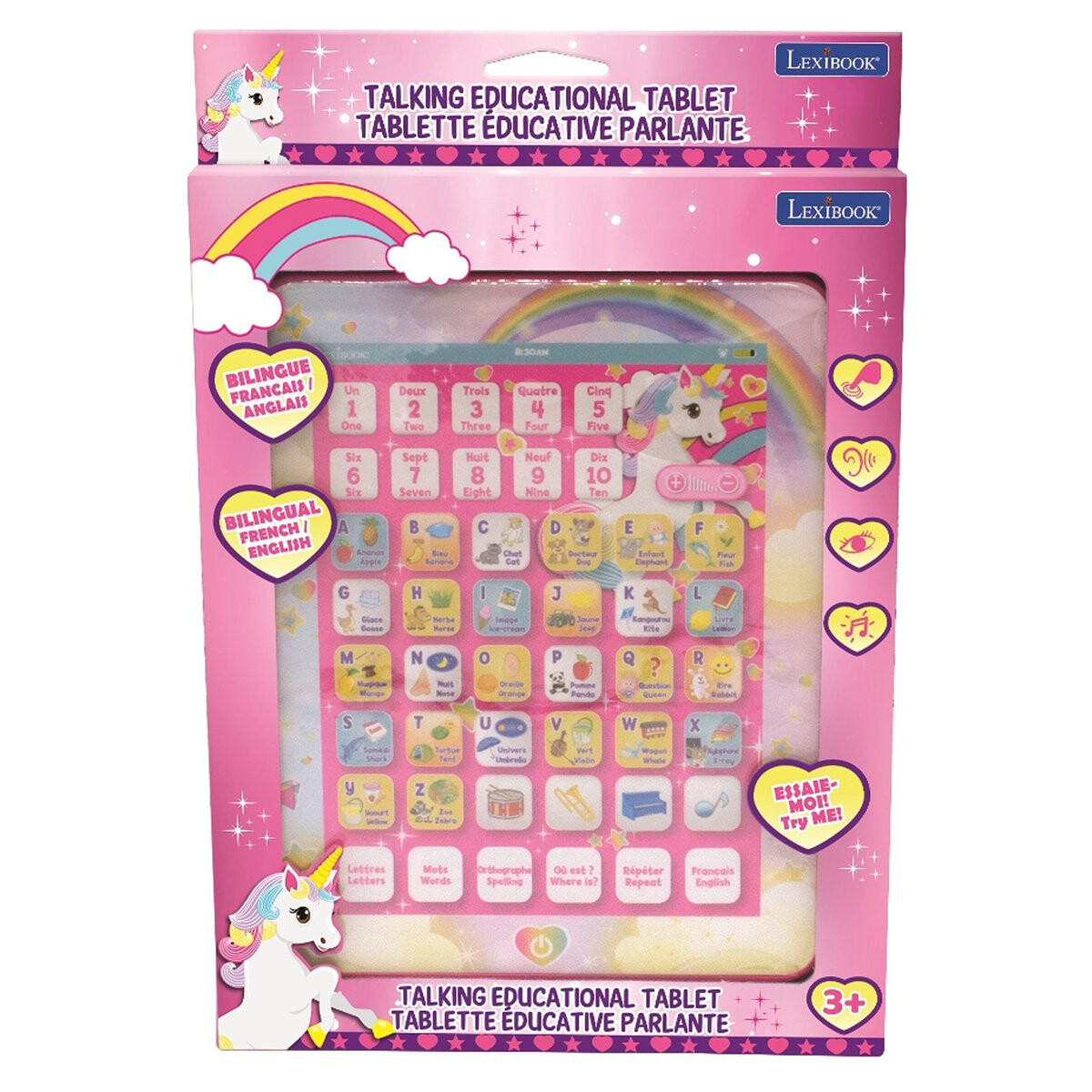 Двуязычный говорящий планшет идеально подходит для изучения чисел, алфавита и словарного запаса на английском и французском языках. Пусть ваши дети учатся в увлекательной игровой форме.
