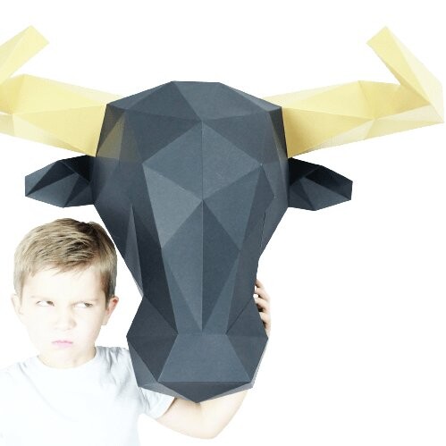 Большая черная голова быка с эффектными золотыми металлическими рогами.