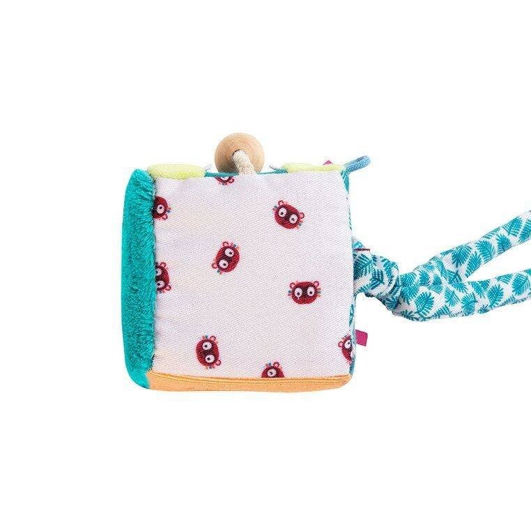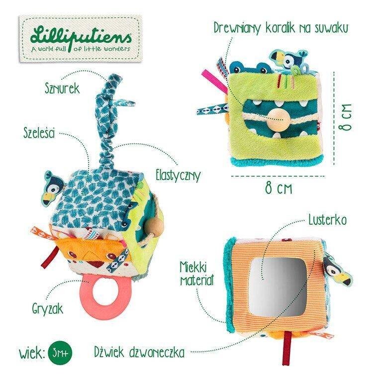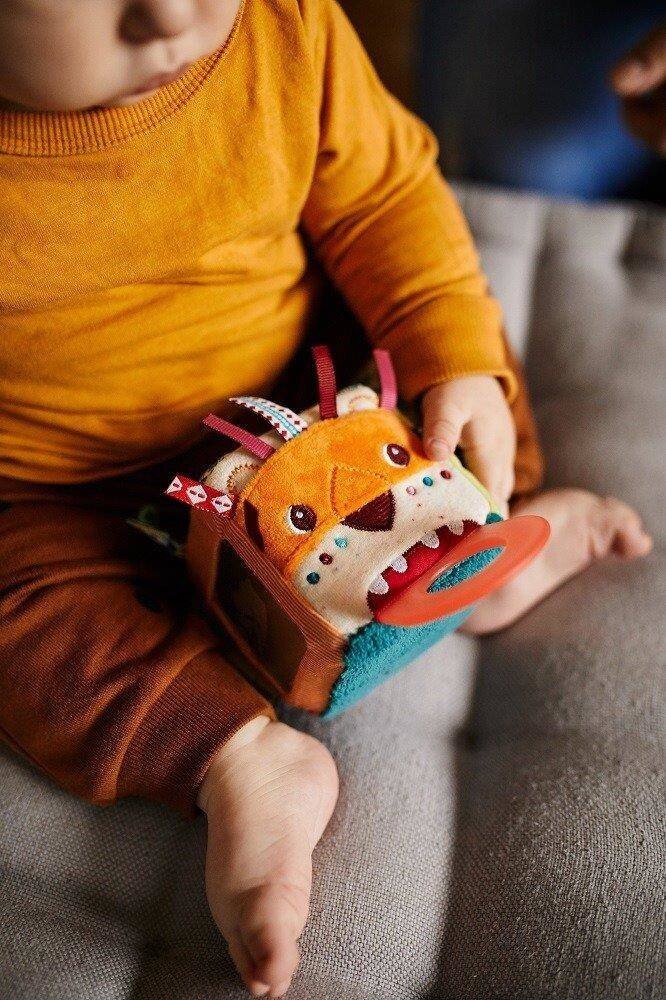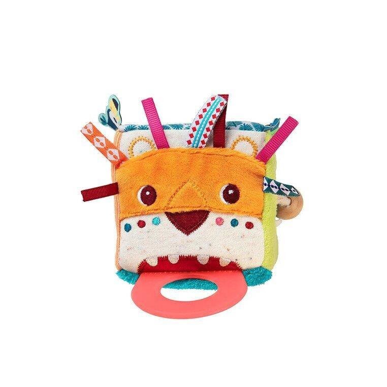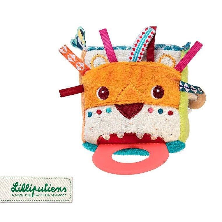 Кубик-активатор из коллекции Lew Jack от бельгийского бренда Lilliputiens — оригинальный, мягкий и многофункциональный источник развлечения и обучения для любознательных малышей. Он изготовлен из материалов с различными рисунками и фактурами и имеет множество скрытых функций. На 4 из 6 граней куба расположены характерные для бренда персонажи: у Льва Джека грива из разноцветных лент, а язык — силиконовый прорезыватель. Крокодил Анатоль пытается проглотить деревянную бусину, которую можно передвигать по веревочке, тукан Пабло охраняет зеркало, а лемур Джордж корчит рожицы. Две другие стороны куба гладкие и пушистые. Куб дребезжит при встряхивании. Игрушка сделана добротно и полностью безопасна. Это удивляет и стимулирует детское воображение. Развивает зрительно-моторную координацию и мелкую моторику (хватание, встряхивание, движение), а также активирует слух (дребезжание), зрение и осязание. и как прорезыватель - приносит облегчение в трудный период прорезывания зубов.