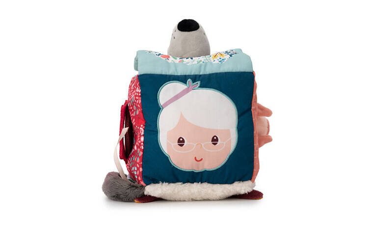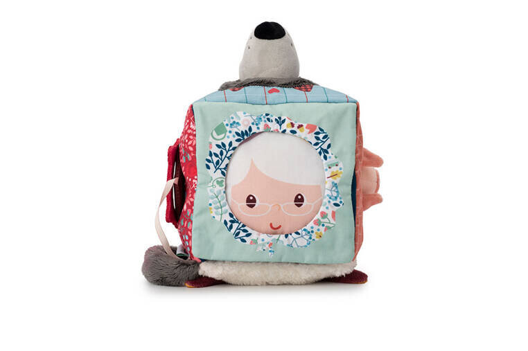 На каждой стороне разный сказочный герой, есть: подвеска из двусторонней ленты - личико Красной Шапочки, которую можно разместить на окошке, круглое мягкое зеркало на пушистой поверхности. с овечьими ушами, мягкий шарик – свинья на веревочке, которую можно снять и вставить в отверстие в щиколотке, пришитое бабушкино лицо и объемная плюшевая мордочка Луиса Волка – оба эти персонажа соединены мягкой стеной с окном, через которое можно менять свой внешний вид.