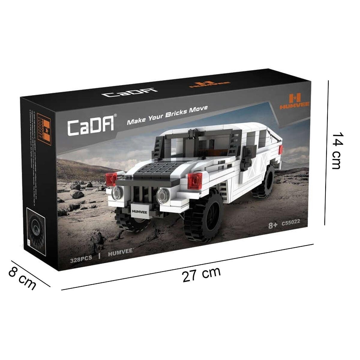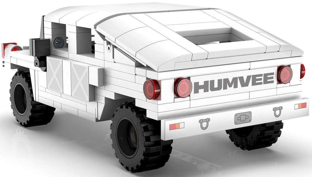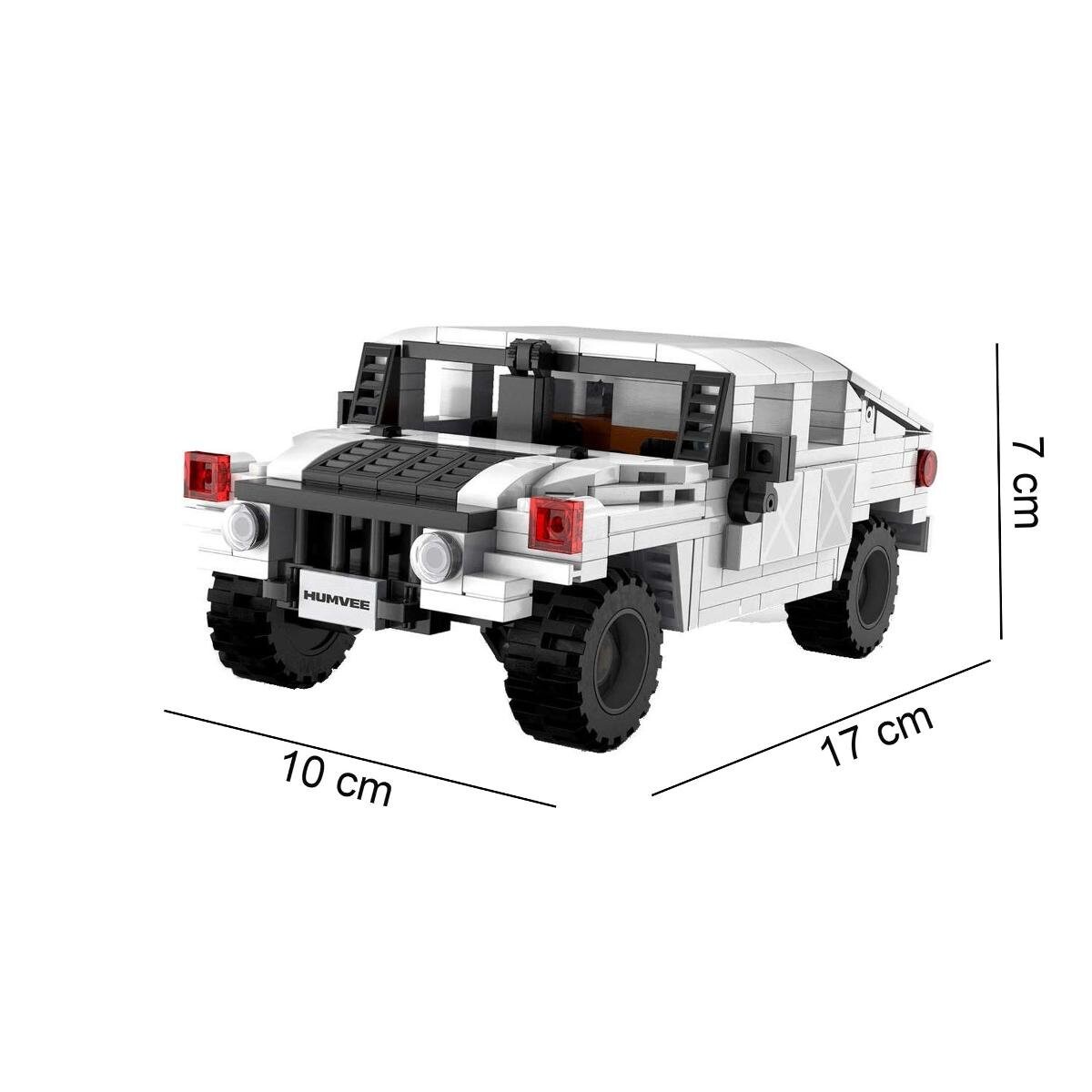 Набор состоит из 328элементов и позволяет собрать настоящие автомобили Humvee американской армии в масштабе 1:24. Автомобиль создан с особым вниманием к деталям, что обеспечит невероятное удовольствие. Он оснащен 4 резиновыми колесами, которые позволяют ему передвигаться по различным поверхностям. У автомобиля желтый кузовс черными элементами.