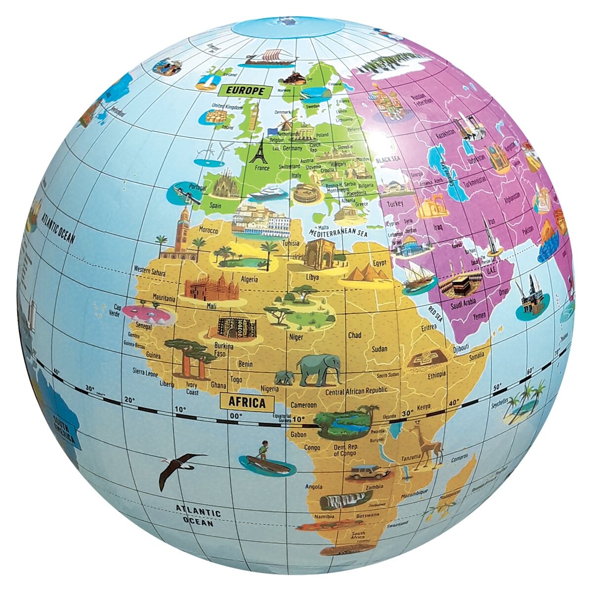 Откройте для себя мир с помощью глобуса! Глобус — это трехмерное изображение нашей планеты, реалистично передающее ее форму и пропорции. Глобус имеет сферическую форму, на которой расположена карта Земли, отражающая характерные особенности каждого из ее регионов. Его часто используют в качестве исследовательского пособия для изучения географии, изучения мира и понимания взаимосвязей между различными частями мира. Как глобус поможет вам углубить географические знания? 3D-визуализация: На глобусе Земля изображена как сферическая сфера, что позволяет лучше понять пространственные взаимоотношения между континентами, океанами и другими географическими объектами. функции. Облегчает поиск: Глобус позволяет нам легче находить и идентифицировать различные географические области. Мы можем отслеживать местоположение стран, городов, рек, горных хребтов и других географических объектов. что помогает нам развивать навыки ориентации. Понимание климатических зон. На глобусе показаны различные климатические зоны на Земле, такие как экваториальная, тропическая и полярная зоны. Мы можем увидеть и понять, как эти зоны распределены по земному шару и как они влияют на климат, растительность и животных. Изучение континентов и океанов: Глобус позволяет изучать континенты и океаны, их расположение, размеры и взаимоотношения. Знание границ стран Глобус — полезный инструмент для изучения границ стран и понимания культурных различий. Кали, мяч «Глобус Чудеса света», 42 смМаленькие путешественники отправляются на поиски мировых диковин.
