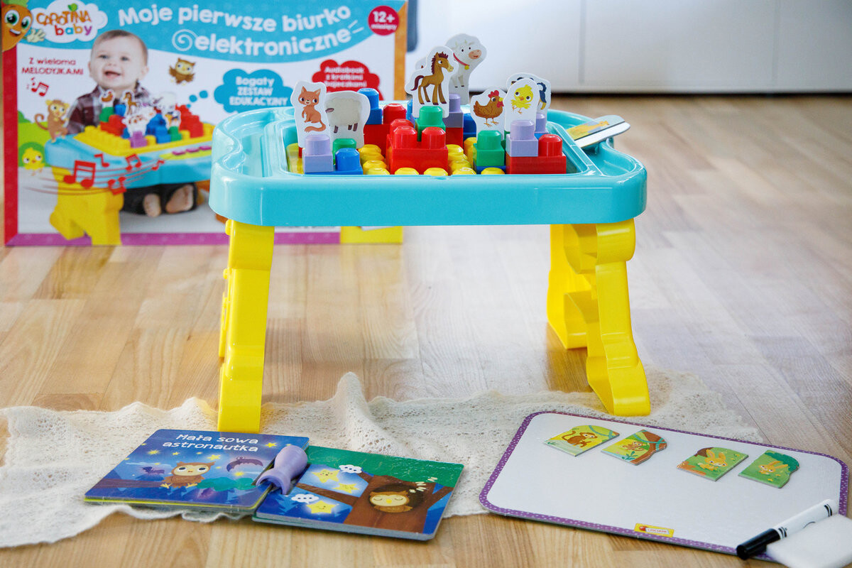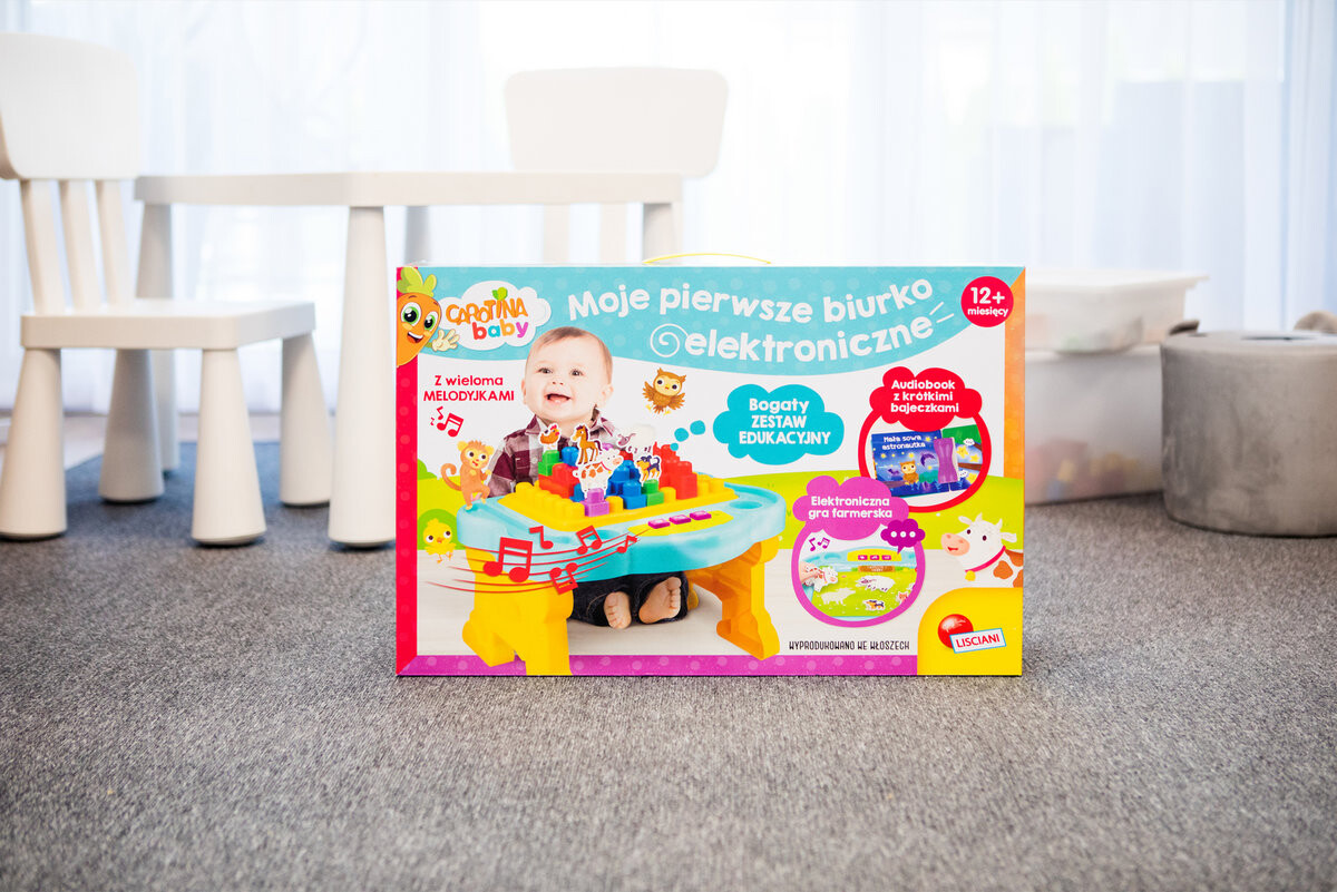 Lisciani, Carotina Baby My First Electronic Desk 7662 (304-Pl7662)Уникальный первый электронный стол для самых маленьких с кубиками и развивающими играми. Электронный модуль позволяет прослушивать несколько электронных историй и одновременно следить за их сюжетом в книге. Электронная игра-ферма позволяет выучить названия животных, а блоки со специальными элементами помогают развивать навыки ручного труда.