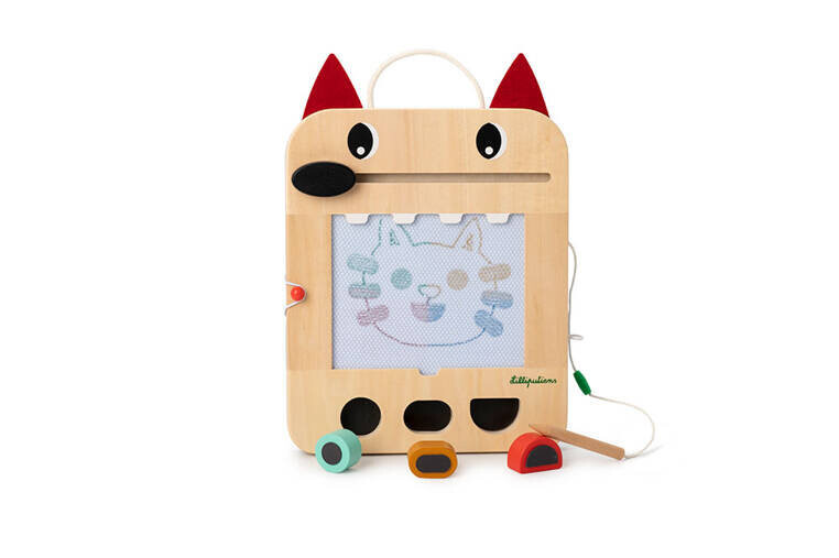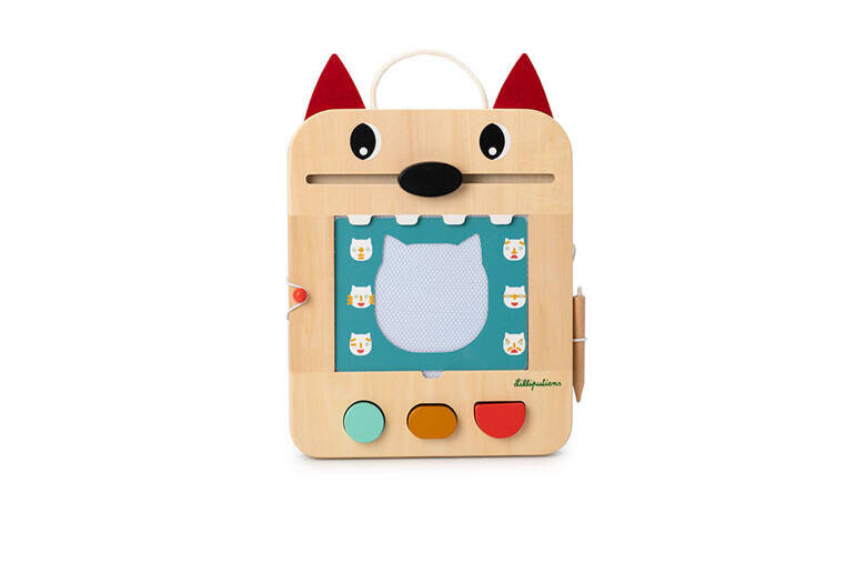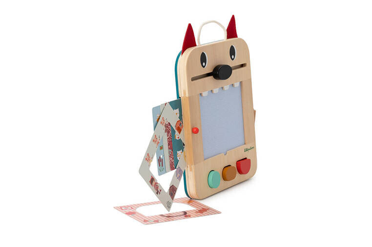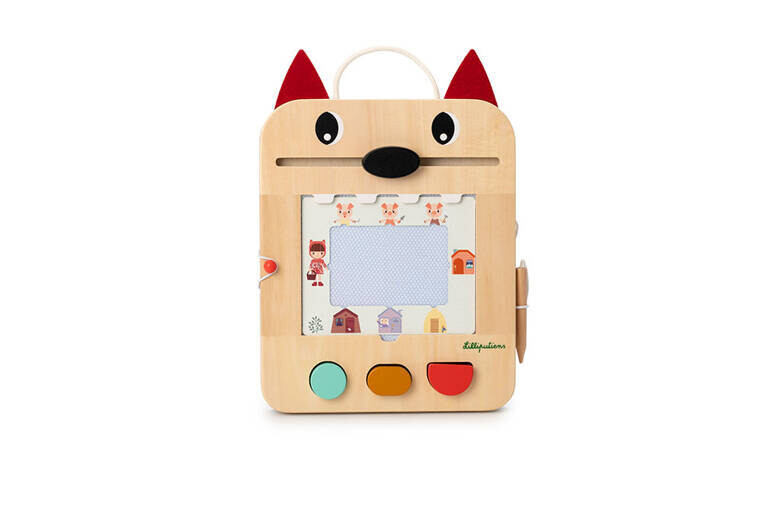 Деревянный скрапборд из коллекции Wilk Louis бельгийского бренда Lilliputiens — оригинальный источник развлечения и обучения для любознательных малышей. Игрушка имеет форму раскрытой волчьей пасти, внутри которой расположен экран, предназначенный для рисования.