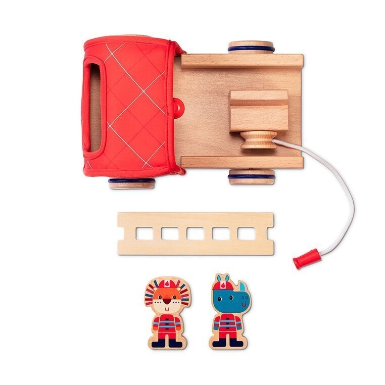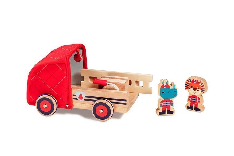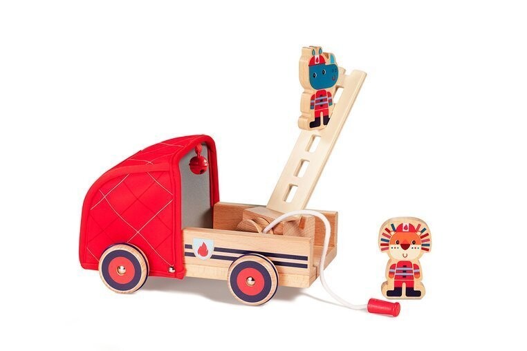 Набор дополнен деревянной лестницей и двумя деревянными фигурками отважных пожарных: Носорога Мариуса и Льва Джека - все в удобных для малыша размерах и позволяющих свободно манипулировать: укладывать героев внутрь и наружу. транспортное средство, сборка лестницы, разматывание и втягивание шланга огнетушителя и т. д.