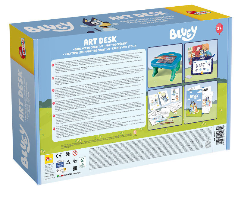 Поистине креативный набор, который позволит вам погрузиться в волшебный мир Блуи. Внутри упаковки находится прочный столик, на котором можно выполнять все активные действия, и доска с маркером для записи и стирания. Благодаря им вы сможете здорово развлечься, рисуя множество раскрасок с героями знаменитого мультсериала, а также наклейки, фломастеры и ленты. В комплект также входит оригинальная тематическая папка художника для хранения всех ваших работ. Это позволит вам взять их с собой. когда захотите. Стол также имеет отсек для хранения, где можно хранить все элементы. Чего вы ждете? Желаем приятно провести время с Блюи.