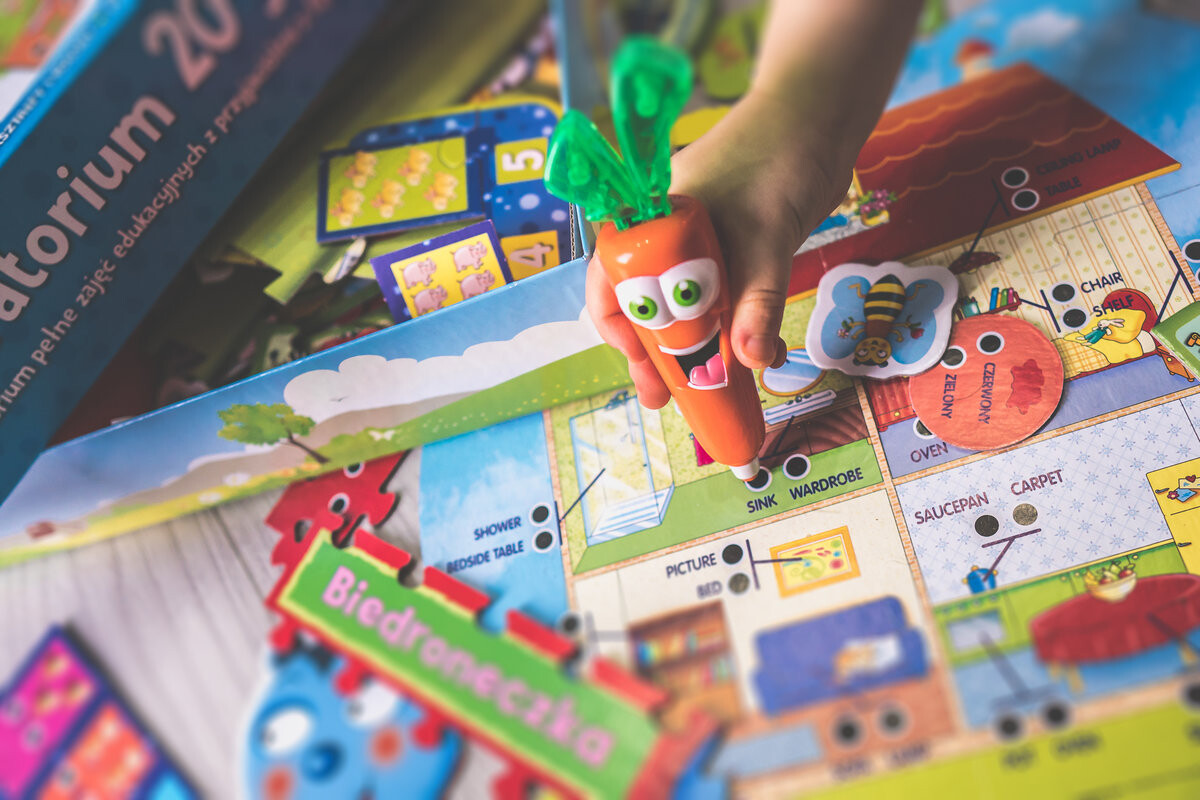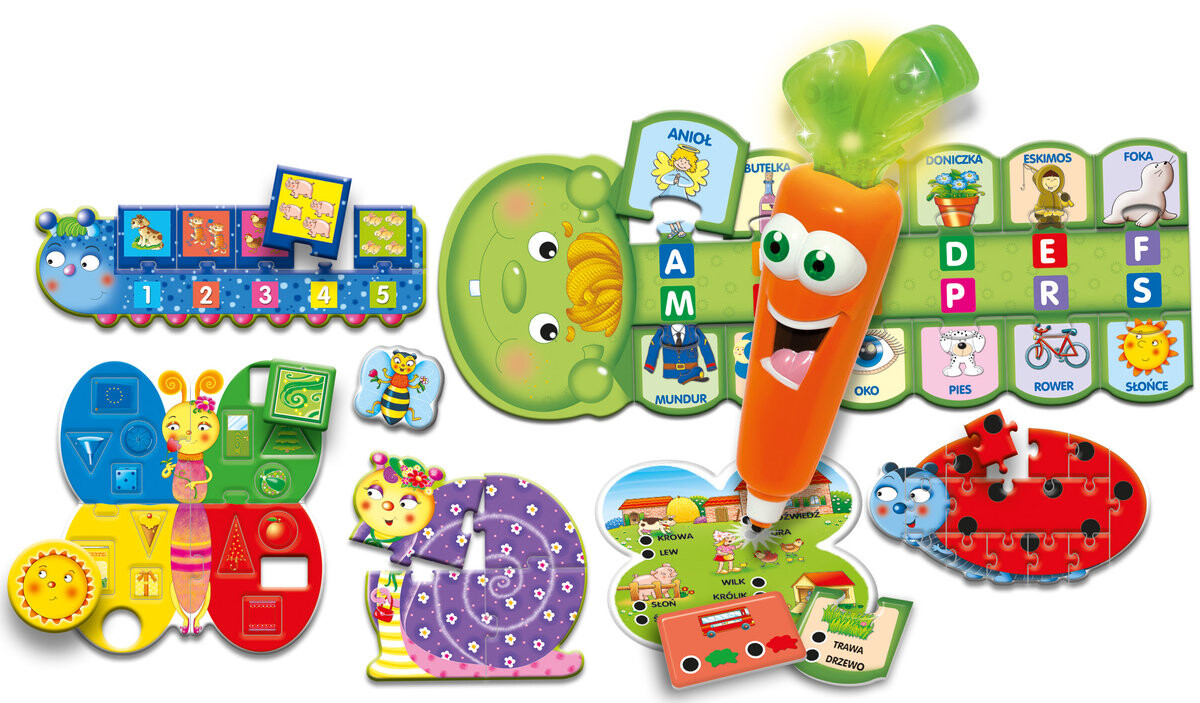 В наборе 20 развивающих игр: Гусеница с буквами, Многоножка с цифрами, Улитка Мисс Вайолет, Лотерея с животными, Памятка с пчелками и множество других игр в виде больших досок, которые вы собираете, весело проводя время!